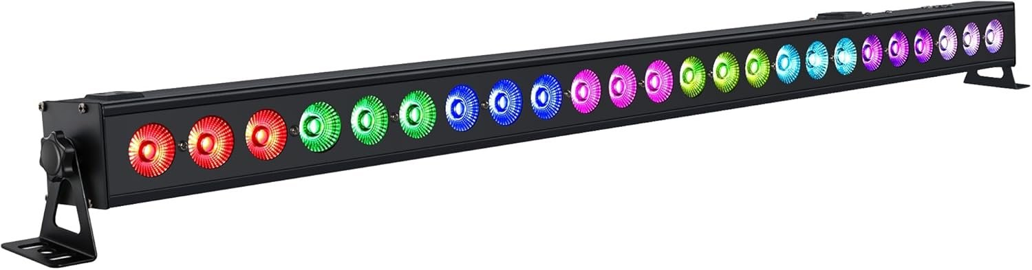 The LaluceNatz 40” 96W 24 LED RGBA Wash Light Bar is designed for versatile stage lighting at events like weddings, parties, and concerts. It features a 40° beam angle, allowing for vibrant color mixing and ambient lighting. Made of aluminum alloy for heat dissipation, it supports DMX control with multiple channel options, enabling various modes such as color fade, strobe, and sound activation. The light bar can daisy-chain up to six units for enhanced effects and operates safely under 100W. It’s suitable for a range of applications, providing a captivating atmosphere.