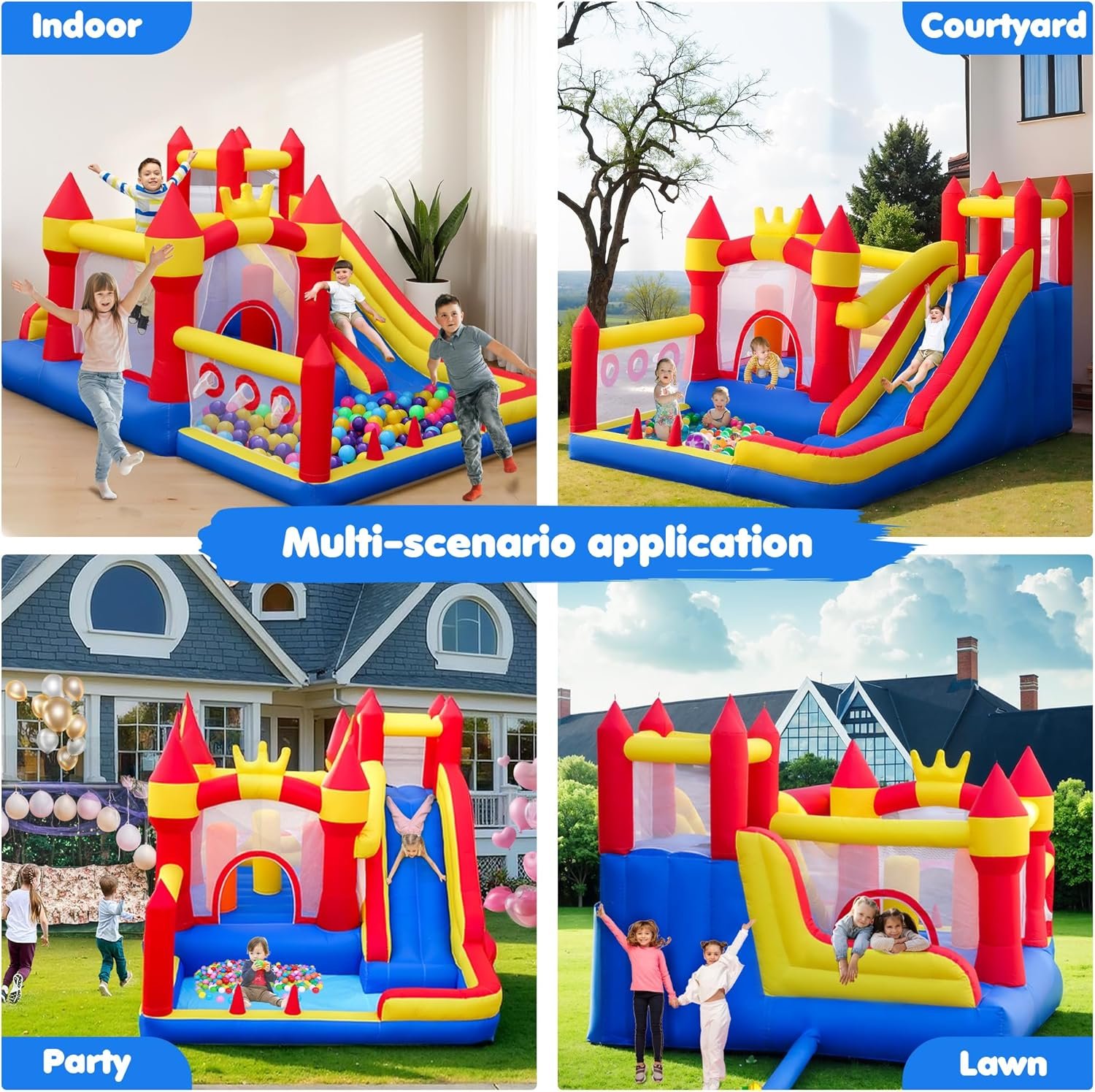 The inflatable bounce house features an exciting 8-in-1 design, including a slide, obstacle poles, trampoline, ball pit, basketball hoop, and climbing wall for endless fun. Made from durable, puncture-resistant materials, it meets ASTM safety standards with reinforced seams and mesh safety walls. It inflates quickly in under 2 minutes with the included 480W blower and can be used indoors or outdoors year-round. With dimensions of 12.73 FT by 8.66 FT, it accommodates multiple children, promoting active play and social interaction, making it a perfect gift for various occasions.