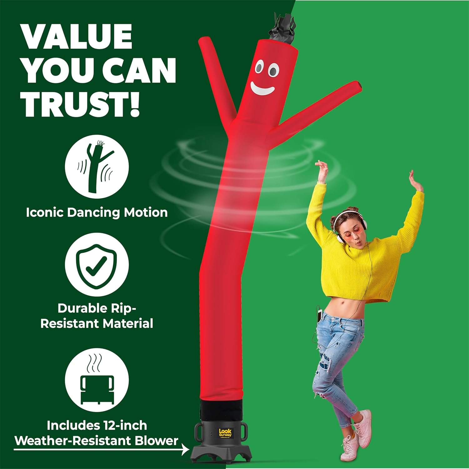 The LookOurWay Air Dancers inflatable tube man set includes a 10ft inflatable tube man and a Sky Dancer Blower, designed to grab attention and boost sales by up to 30%. This cost-effective marketing tool features a wacky waving motion and durable material, ensuring longevity. The blower includes handles for easy transport and accommodates lighting. Suitable for various businesses like auto dealerships and restaurants, the set promotes events and grand openings effectively. Specifications include power requirements and dimensions, making it an ideal choice for eye-catching advertising.