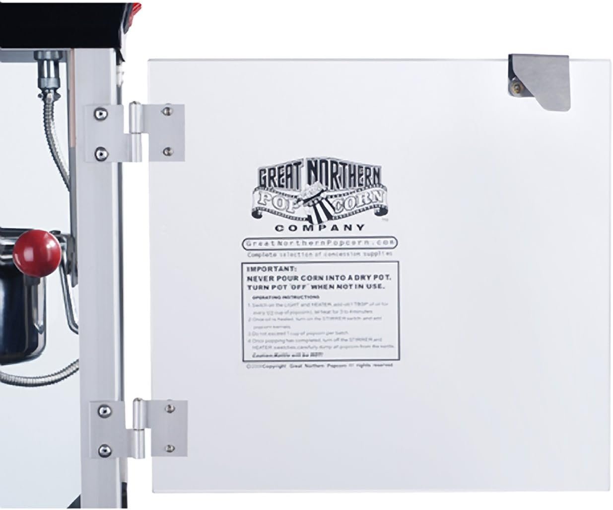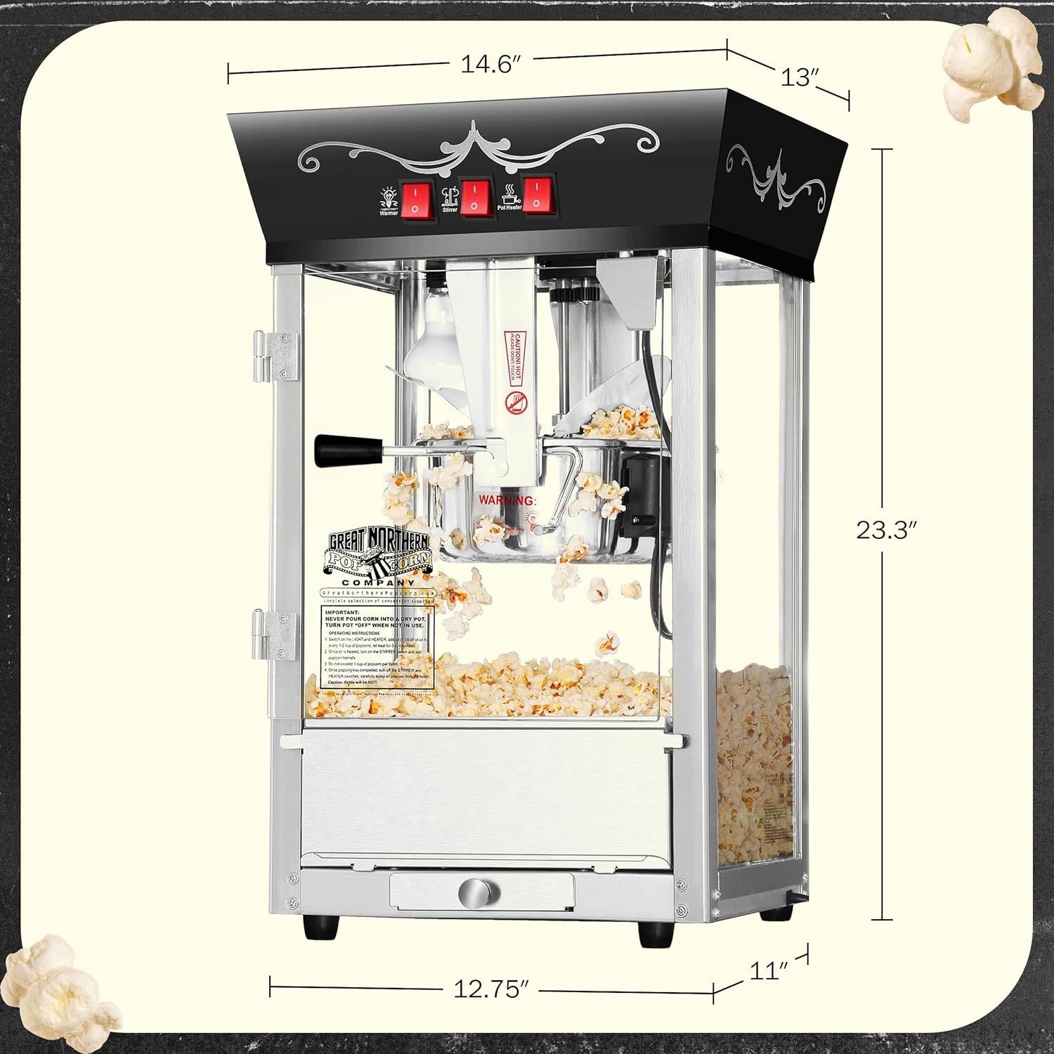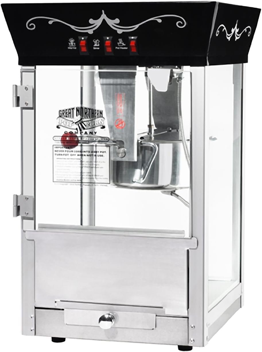 The Matinee Popcorn Machine by Great Northern Popcorn brings the cinema experience home, producing up to 3 gallons (48 cups) of popcorn in minutes while remaining compact and portable. It features a stainless-steel kettle with a built-in stirrer, tempered glass panels for safety, and an easy-to-clean design with a reject kernel tray. The machine’s 3-switch operation allows independent control of the kettle heater, stirrer, and warming light, making it user-friendly. Perfect for family movie nights or parties, it also includes measuring cups, a scoop, 50 popcorn bags, and 3 popcorn buckets. Great Northern Popcorn guarantees authenticity and quality.