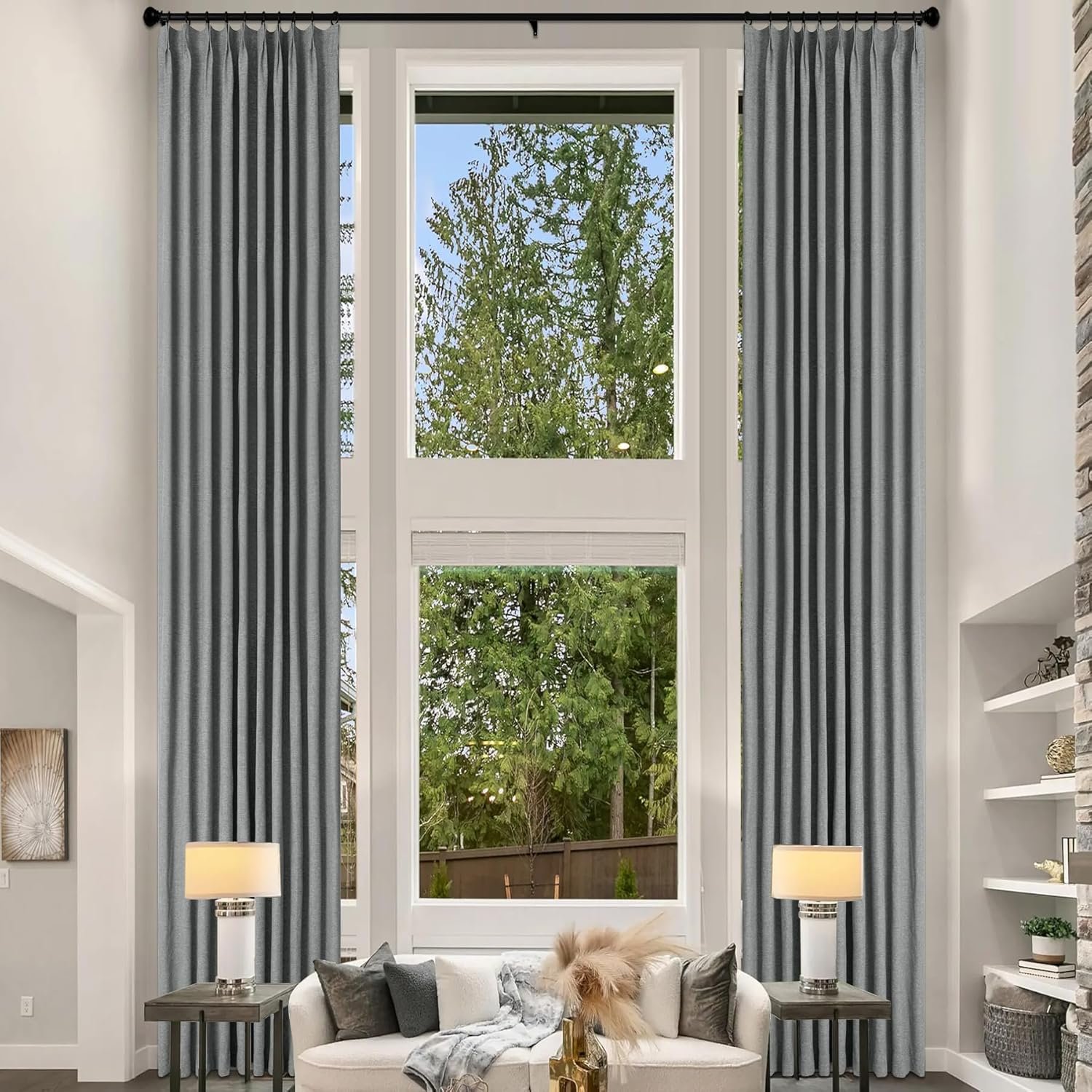 This product features pinch pleat top curtains made from 100% blackout linen blend fabric, ensuring full light blocking. They come with adjustable pin hooks and include a matching tieback. Offering thermal insulation, noise reduction, and privacy protection, these elegant curtains serve multiple purposes for home decor. Available in various materials, they are easy to care for and suitable for customization in size and header style. Customer reviews reflect high satisfaction, with an average rating above 4.5 stars. Prices range from $12.99 to $155.98, depending on the chosen option.