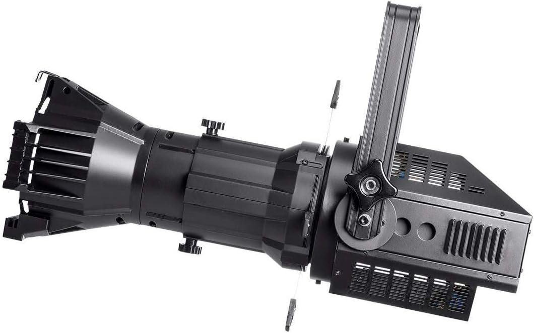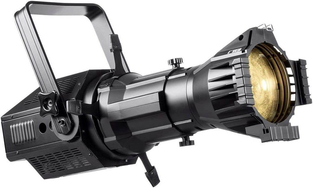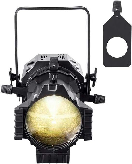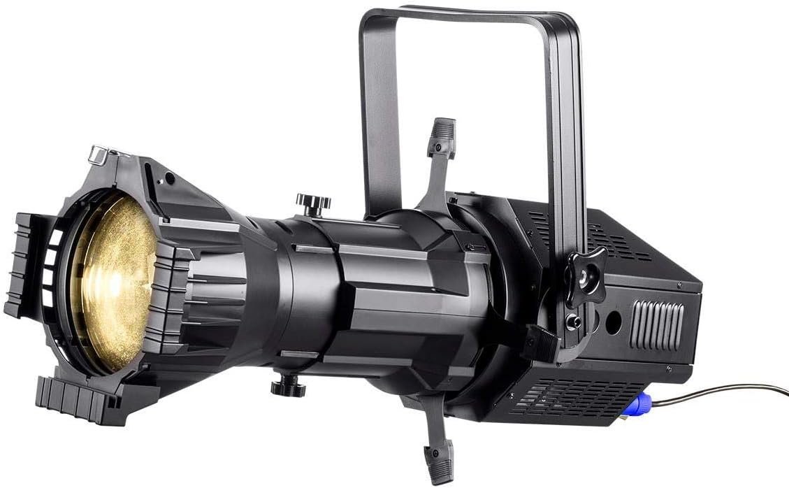 The Stage Right 200W COB LED Ellipsoidal features a 200-watt white LED with a 19° beam angle, producing up to 5274 lux at 3200K. It offers adjustable beam size through four shutters, manual focus, and 3-channel DMX512 control for dimming and strobe functions. Additionally, it includes a built-in strobe program and can function as a DMX Slave light. The fixture operates on NAC3 power input/output and measures 22.8″ x 11.0″ x 8.3″, weighing 17.6 lbs. Power consumption is up to 220 watts with an input voltage of 100-240 VAC.