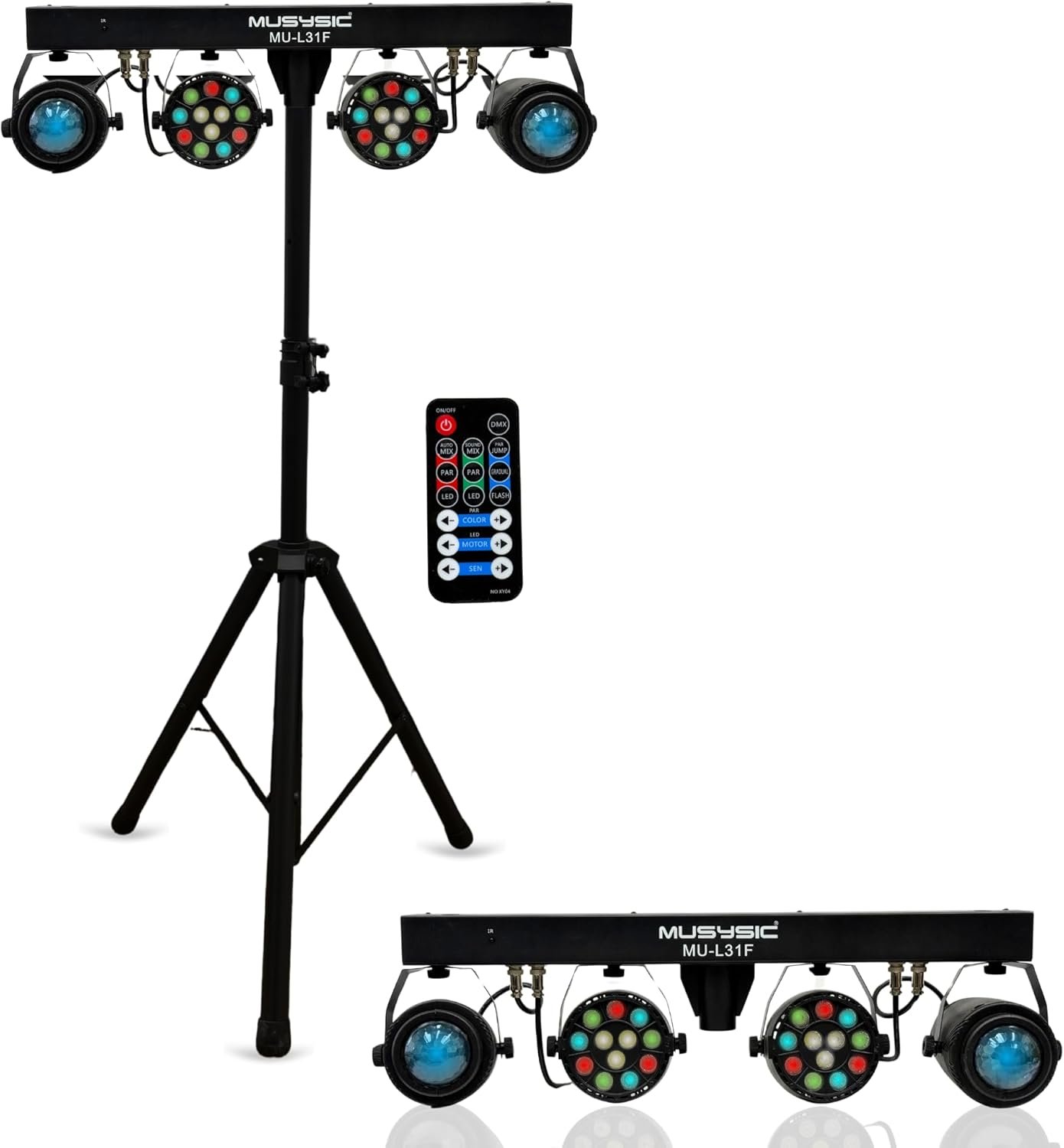 The MUSYSIC Stage Lights provide an easy setup and intuitive control, featuring a user-friendly interface and a DMX controller for synchronized lighting effects. With DMX input and output, multiple devices can be connected for complex displays. The lighting system, equipped with high-intensity RGBW LEDs, offers various modes, including strobe and sound activation, suitable for concerts and performances. It includes a tripod stand for easy assembly, works with AC power, and is lightweight. Designed for both novices and experts, these lights enhance any event with vibrant visual effects.