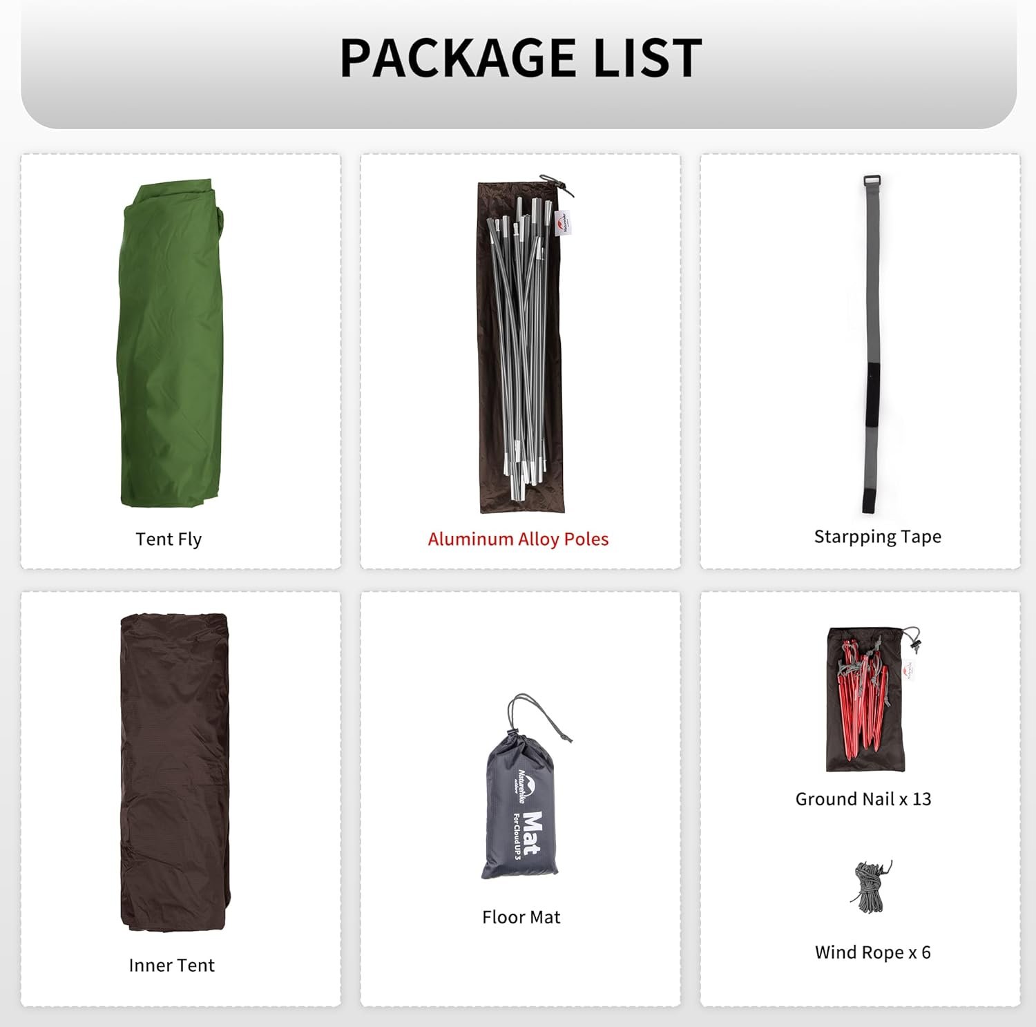The Naturehike Cloud Up 3-Person Tent is designed for easy assembly with aluminum alloy poles, taking less than two minutes to set up. Made from waterproof 20D nylon with a PU4000mm silicone coating, it ensures durability against heavy rain and wind. The tent features a spacious interior (84.6″ x 70.8″ x 43.3″) and extra vestibule space for gear storage. Lightweight at 2.3kg (5.07lbs), it fits well in backpacks. The double-layer design allows for ventilation, and it includes a footprint, stakes, and a carry bag, making it ideal for various outdoor activities like hiking and camping.