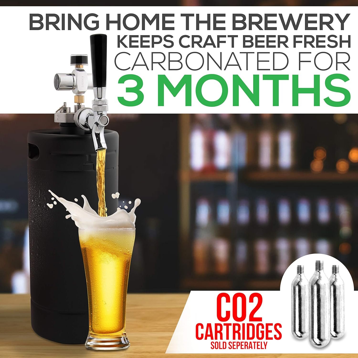 The compact and portable mini keg system keeps carbonated drinks fresh for up to 3 months, featuring a unique dimple shape and solid stainless steel construction. It includes all necessary components for easy assembly, filling, and cleaning. The new spear cap design allows detaching the regulator and spout while maintaining pressure. With an adjustable pressure regulator, it ensures the perfect beer head, and works with disposable threaded CO2 cartridges. The keg measures 5.3″L x 5.3″W x 14.25″H, fitting standard kegerators and refrigerators, and boasts a no-scratch powder-coated finish for durability.