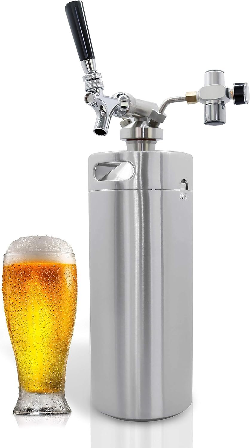 NutriChef Pressurized Growler Tap System – 128oz Stainless Steel Homebrew Mini Keg Dispenser Portable Kegerator Kit – Co2 Pressure Regulator Keeps Carbonation for Craft Beer, Draft –