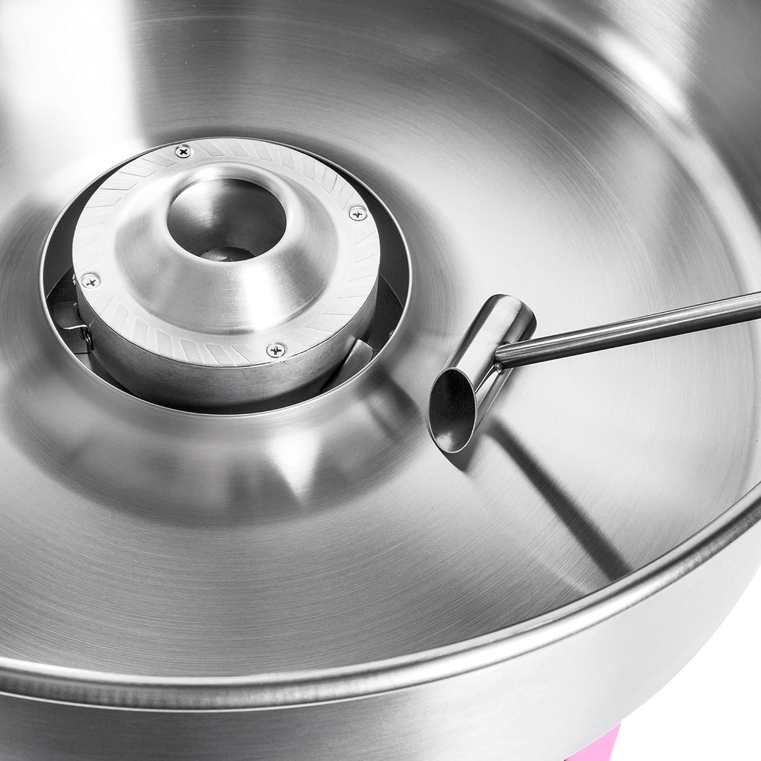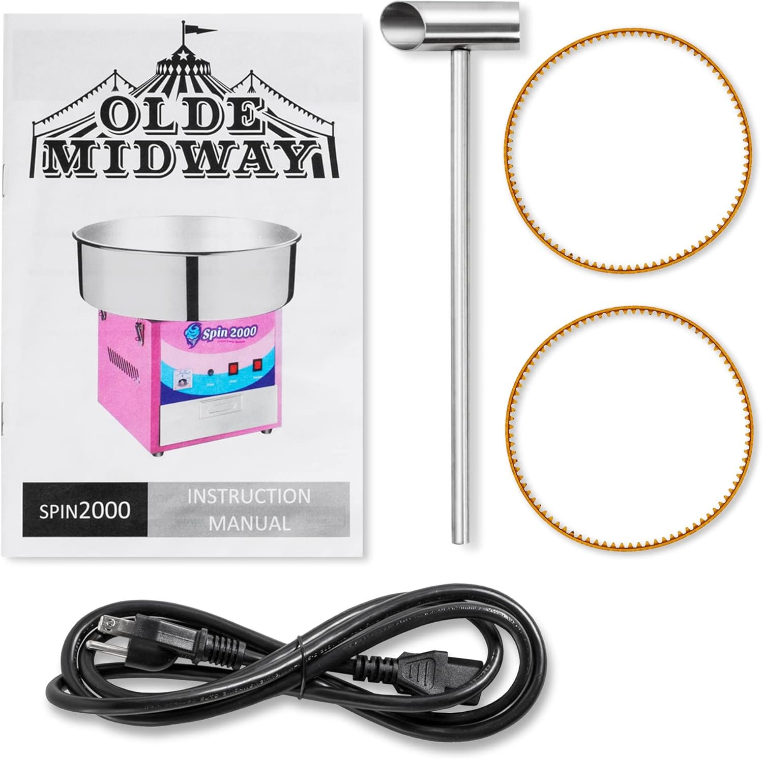 The Olde Midway SPIN 2000 Cotton Candy Machine is a commercial-grade device that creates fluffy cotton candy quickly, producing a batch in about 30 seconds after a 2-4 minute warm-up. Featuring a powerful 950-watt heating element and a spacious stainless steel bowl, it operates quietly and is easy to use with only two switches for power and heat. The machine includes a built-in 3-bin storage drawer and can be paired with a mobile cart for convenience. It comes with accessories like a sugar scoop and spare motor belts, making it perfect for parties, fundraisers, and events.