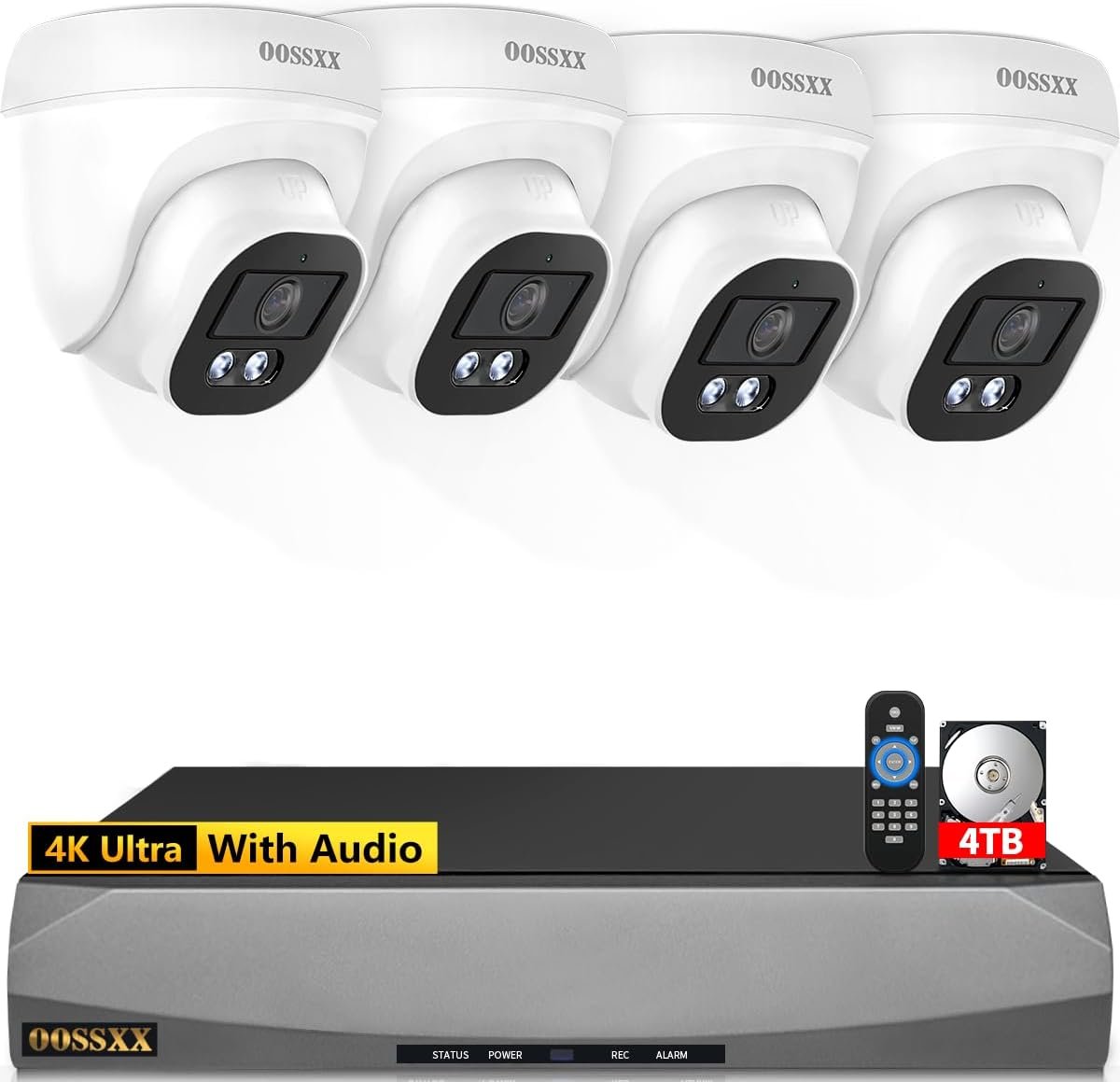 The OOSSXX Security Camera System offers a range of products, including Wireless IP Kits, NVRs, and high-definition cameras, used in over 30 countries. The all-in-one PoE system supports easy installation with 60ft cables, and features include 130° ultra-wide lens, built-in microphones for audio monitoring, advanced AI human detection, and H.265+ video compression for improved clarity. The system supports multi-user streaming for up to four users and features a 4TB hard drive for 60 days of storage. It’s designed for durability with IP66 waterproofing and can operate in various conditions.