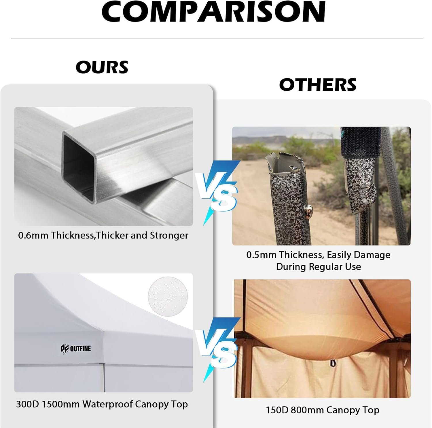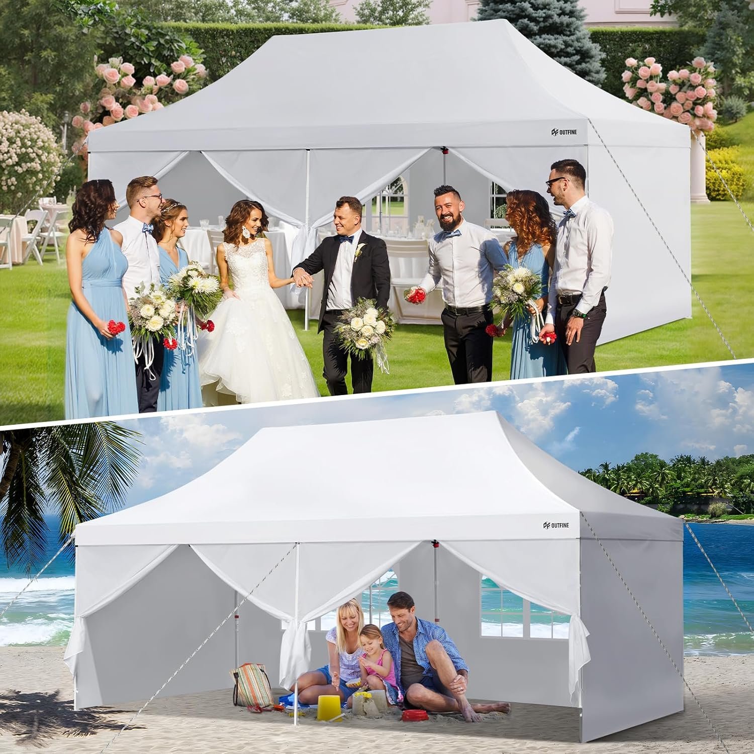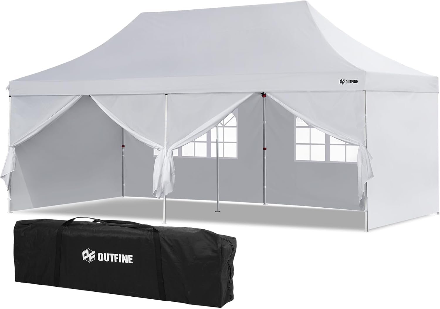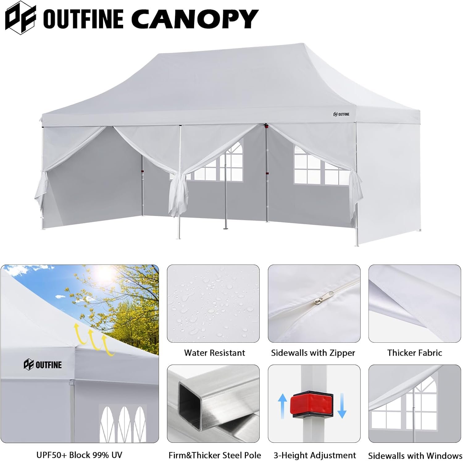 The OUTFINE Canopy features premium 300D Oxford fabric for durability and weather resistance, supported by thicker steel poles and additional stability rods. It includes sidewalls with zippers for insulation and privacy. The easy setup requires 3-4 people, and it comes with various accessories like sandbags, stakes, and a carrying bag. Its maximum height is adjustable, and it’s suited for diverse outdoor events, while advising caution during severe weather. The canopy boasts a waterproof rating of 1000 mm and UV protection of 50+. Priced around $84.99 to $149.99, it comes in multiple sizes and styles.