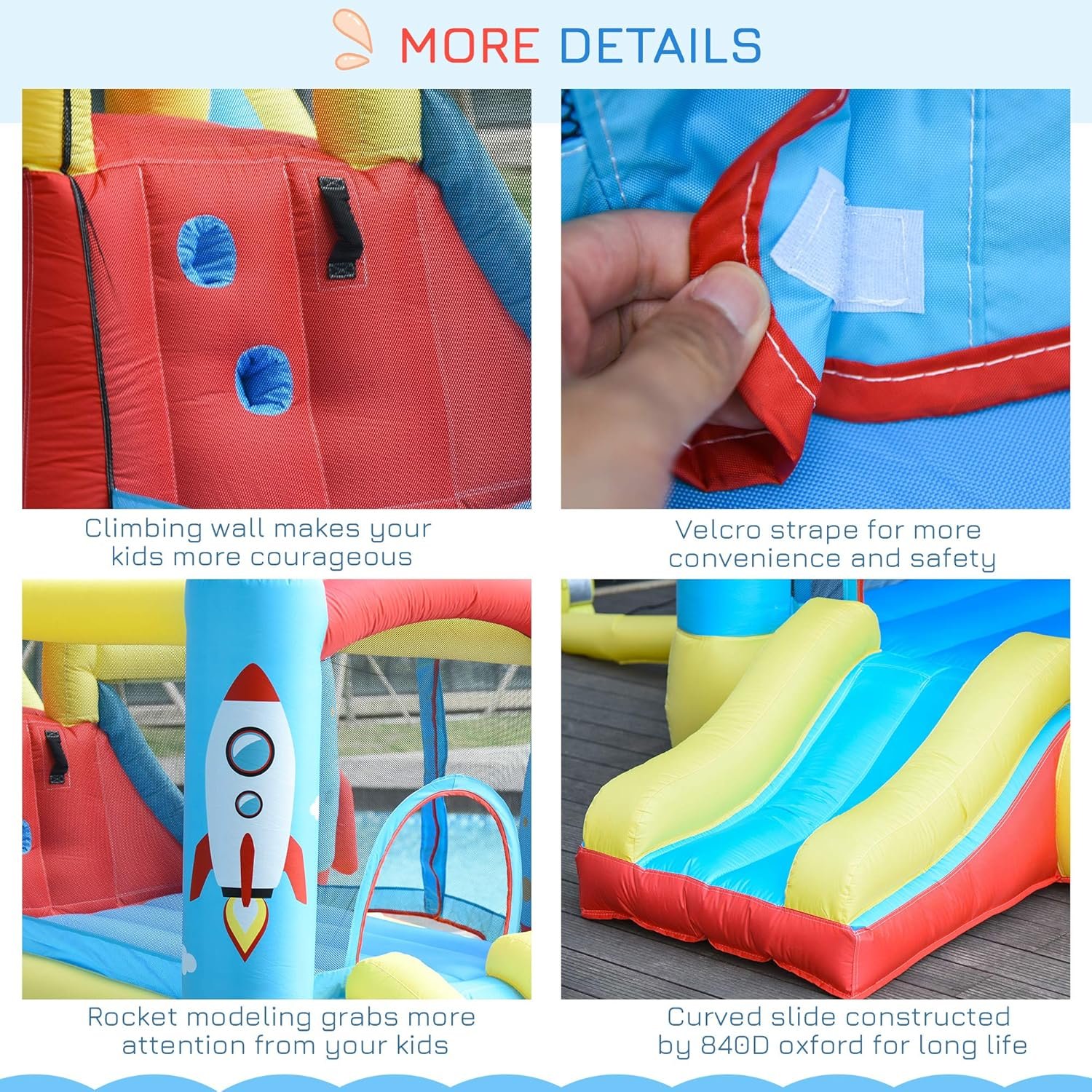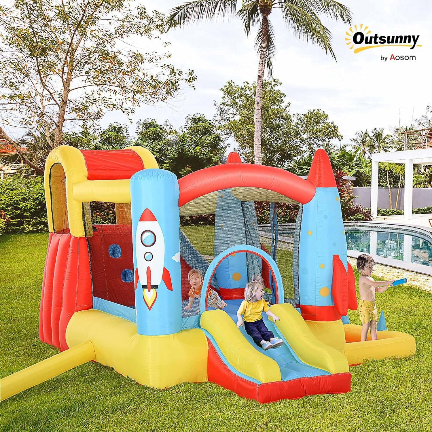Outsunny Kids Bounce House, 4-in-1 Rocket Inflatable Water Slide Jumping Castle with 2 Slides, Climbing Wall, Trampoline, & Water Pool Area, Air Blower