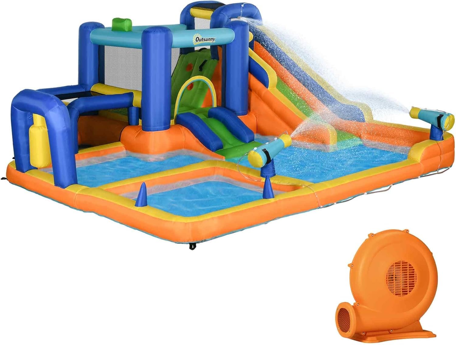 Outsunny Kids Inflatable Water Slide 7-in-1 Bounce House Water Park Jumping Castle with Water Pool, Slide, Soccer Goal, Basketball Hoop, Boxing Post Climbing Walls, & 2 Water Cannons, 450W Air Blower