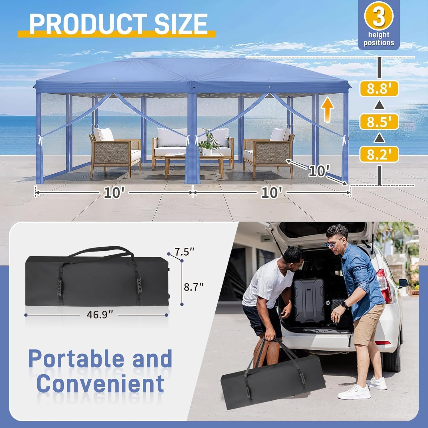 The 10 x 20ft Practical Waterproof Folding Tent is ideal for outdoor activities like camping and picnics. Made from durable 210D oxford fabric and steel, it features six mesh sides for ventilation. The tent is easy to set up using a one-touch design and is adjustable in height. It includes 18 ground stakes and 12 wind ropes for stability. Weighing 60.63 lbs, it provides a spacious area for over 20 people and is equipped with UV protection. The tent folds compactly for easy transport and comes with a carrying bag and a one-year warranty.