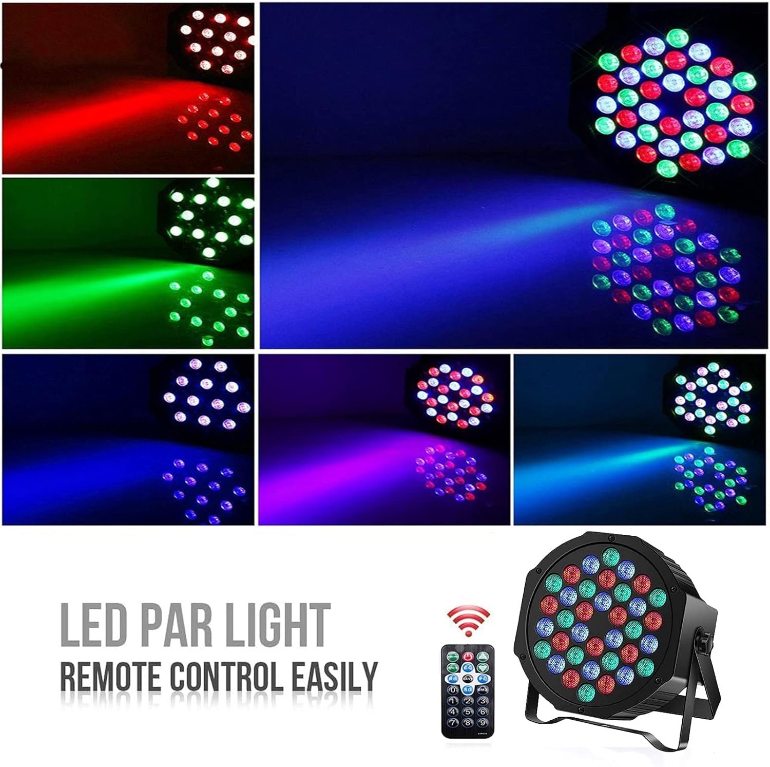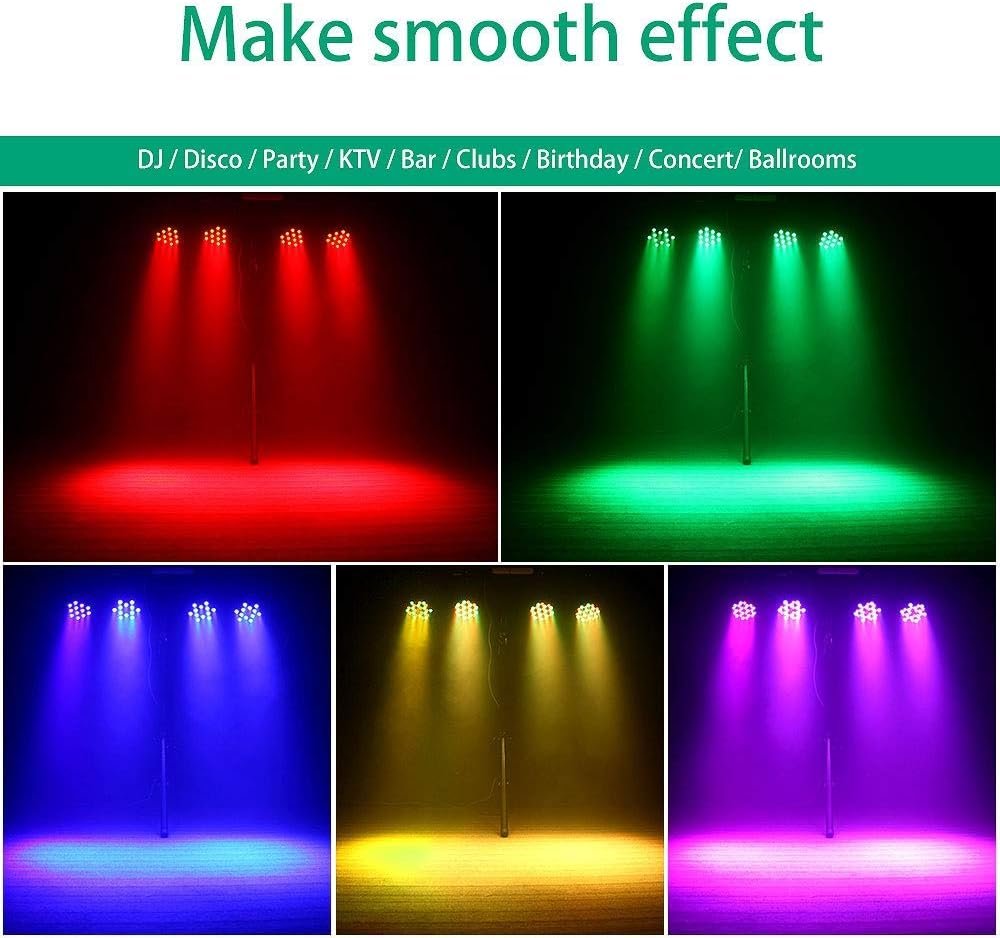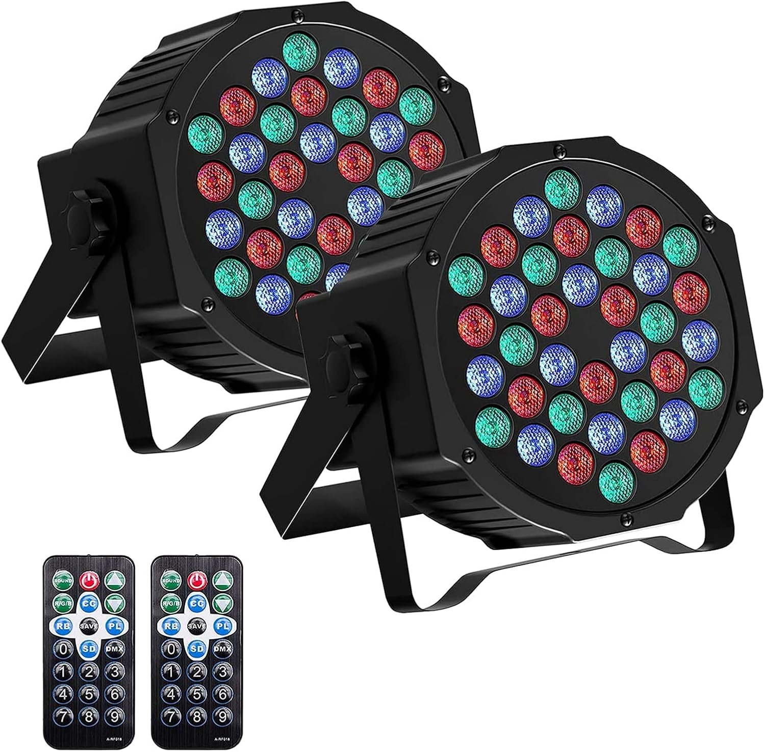2 Pack 36 LED RGB Lights: Featuring 36 RGB LEDs for vibrant stage and party lighting. With 7 adjustable modes—including Static Color, Color Changing, and Sound Sensitivity—these lights are easy to install. Control multiple units via DMX, or enjoy remote control for effortless mode changes. Perfect for any event!