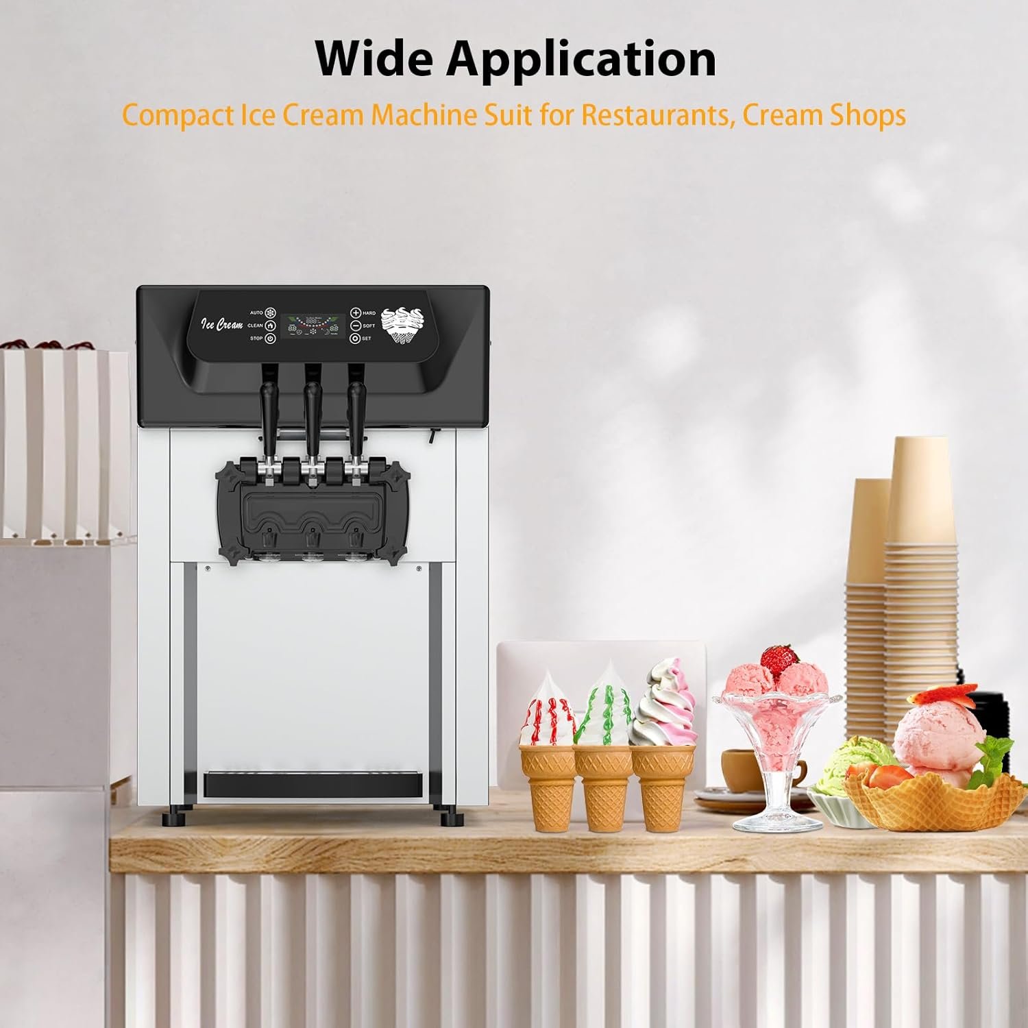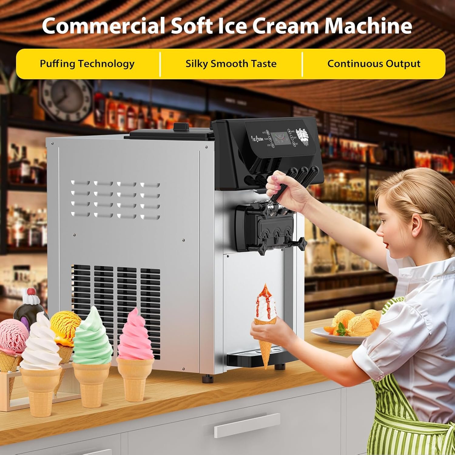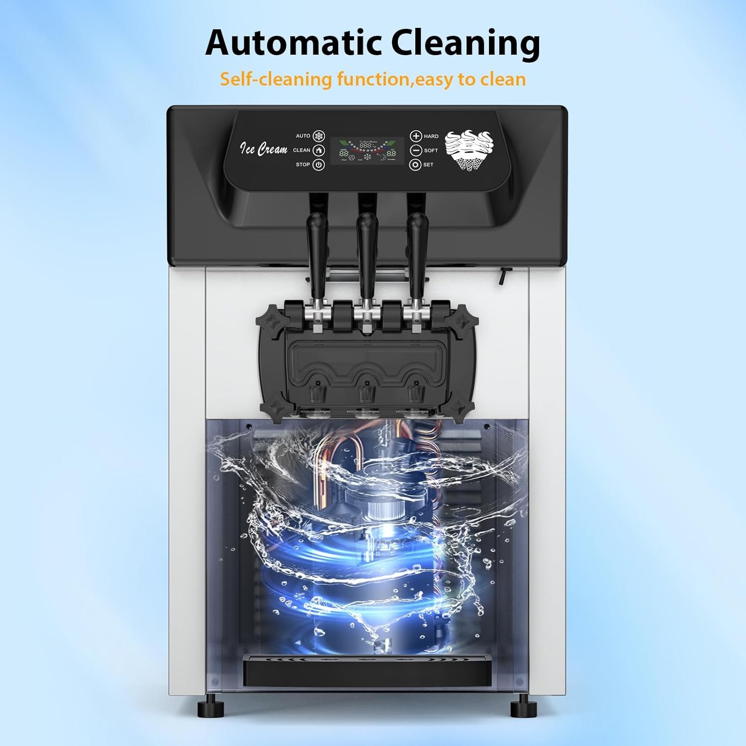 The PioneerWorks Commercial Ice Cream Maker delivers 5.3 to 7.4 gallons per hour, perfect for high-demand situations. Create 3 flavors at once and enjoy a robust 2200W compressor for rapid cooling. With a user-friendly LCD control, serving delicious treats has never been easier!