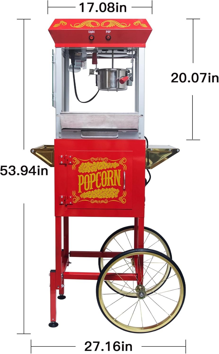 Transform your home with our vintage-style Popcorn Maker Professional Cart, inspired by early 1900s movie houses. It features an 8oz stainless-steel kettle, capable of making 2 gallons of popcorn per batch, with a heated deck and an “old maids” drawer for easy cleanup. Built from durable materials, this 640-watt machine has a detachable cart with bicycle-style wheels and a storage compartment. Designed for ease of use, it includes a two-switch control for the spotlight warmer and stirrer. Dimensions are 17.1″ x 14.1″ x 56.5″, and it comes with popcorn accessories for a fun experience.