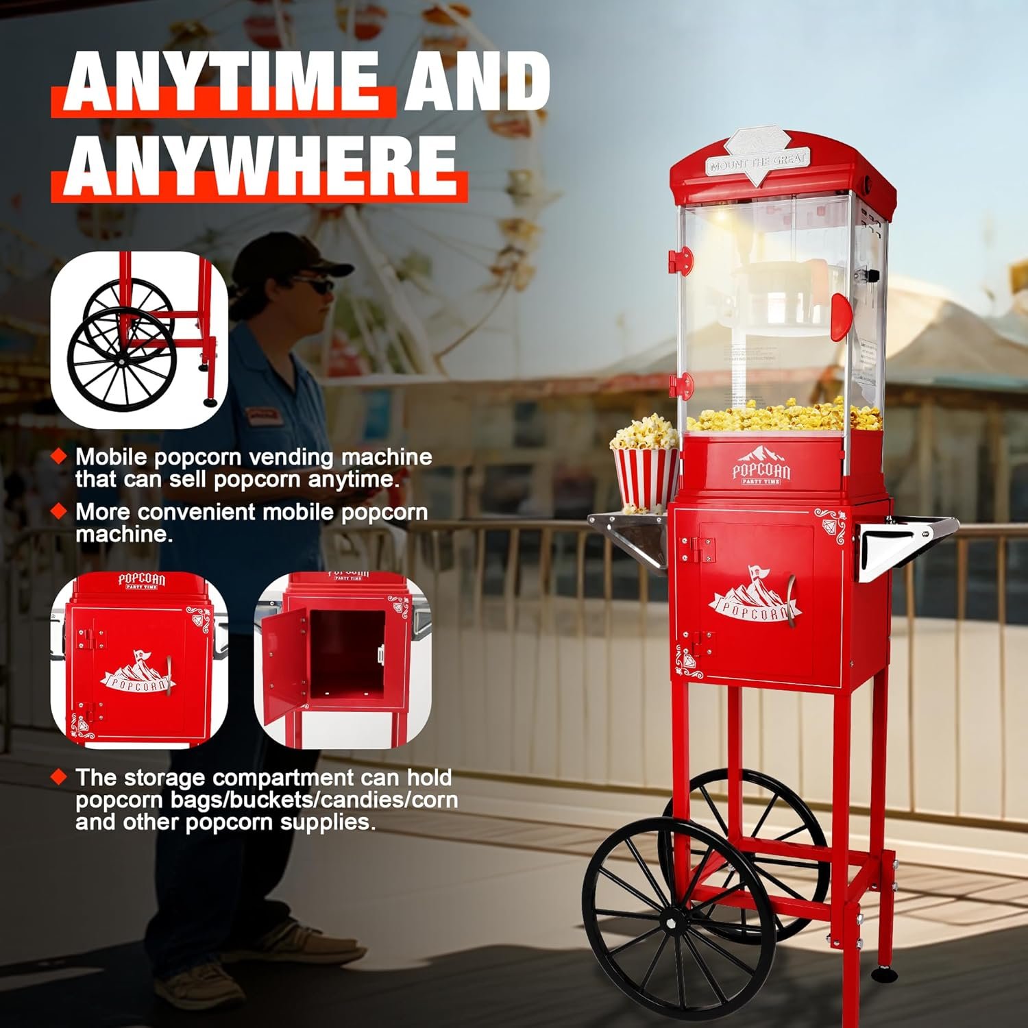 The Molufeibe 10oz portable popcorn maker is perfect for home and light commercial use, serving 8-15 people in just 3-5 minutes. Ideal for gatherings, parties, and small businesses, it features a built-in storage compartment for ingredients and a detachable design for easy cleaning. With a single-button operation and a warm light for a theatrical feel, this electric popcorn cart combines convenience and fun. Made of durable materials, it includes all necessary accessories. Its compact size enhances storage, making it suitable for various occasions like weddings and holidays.