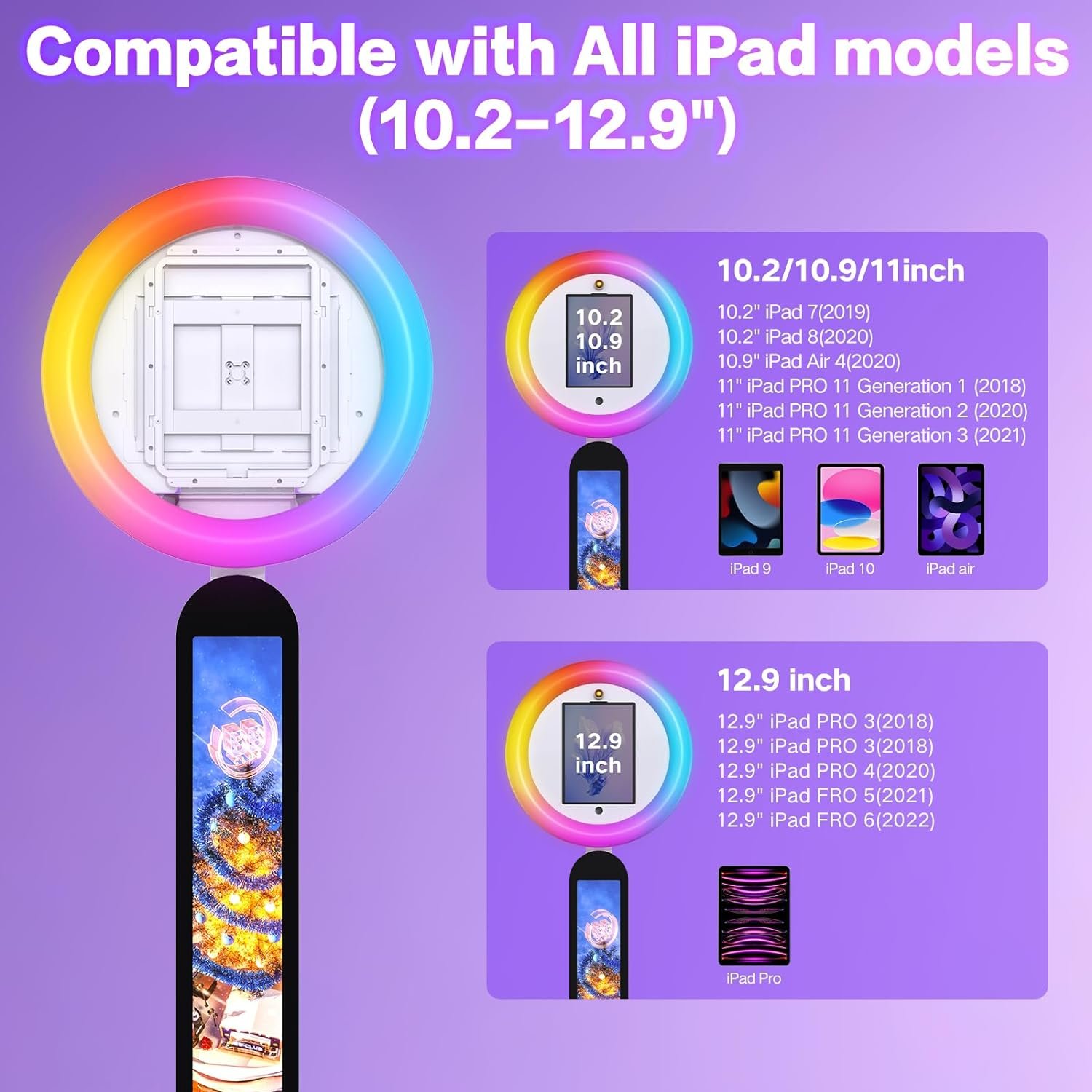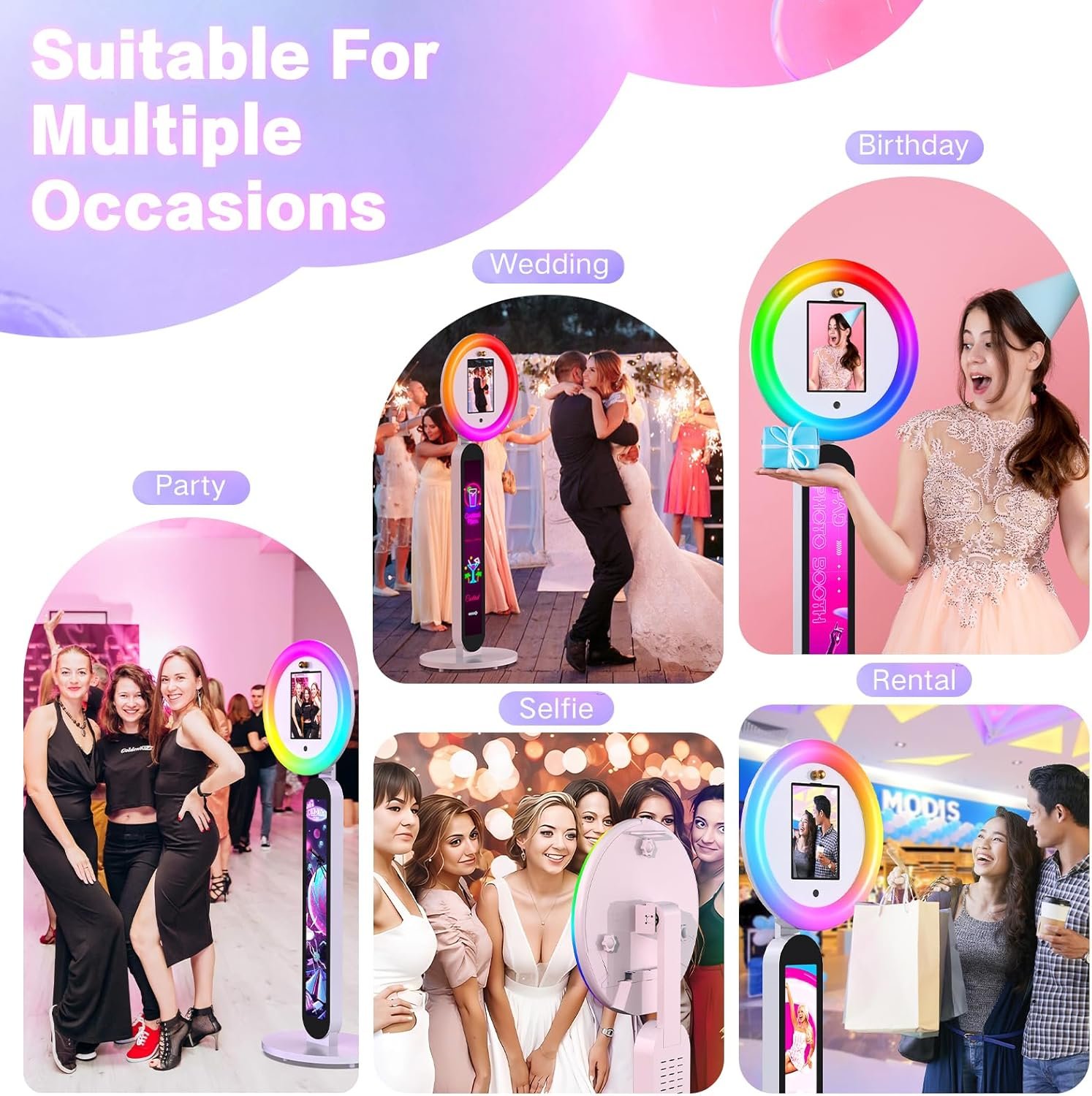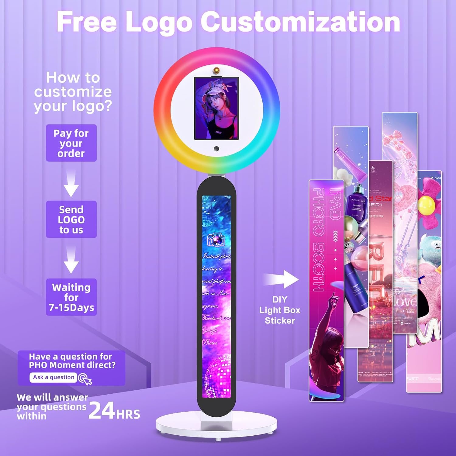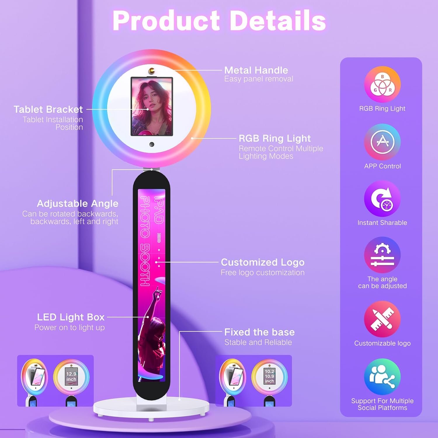 The Portable Photo Booth is compatible with iPads ranging from 10.2 to 12.9 inches, ideal for capturing photos and videos for creators and events. It features a customizable logo option, a 22-inch RGB ring light with 16 million colors, and adjustable brightness. Designed for simplicity, it allows easy iPad swaps with adjustable panels. Wdiauedu offers reliable customer support, including a two-year replacement policy for quality issues. Perfect for weddings, parties, and professional use, this photo booth enhances content creation with its versatile features.