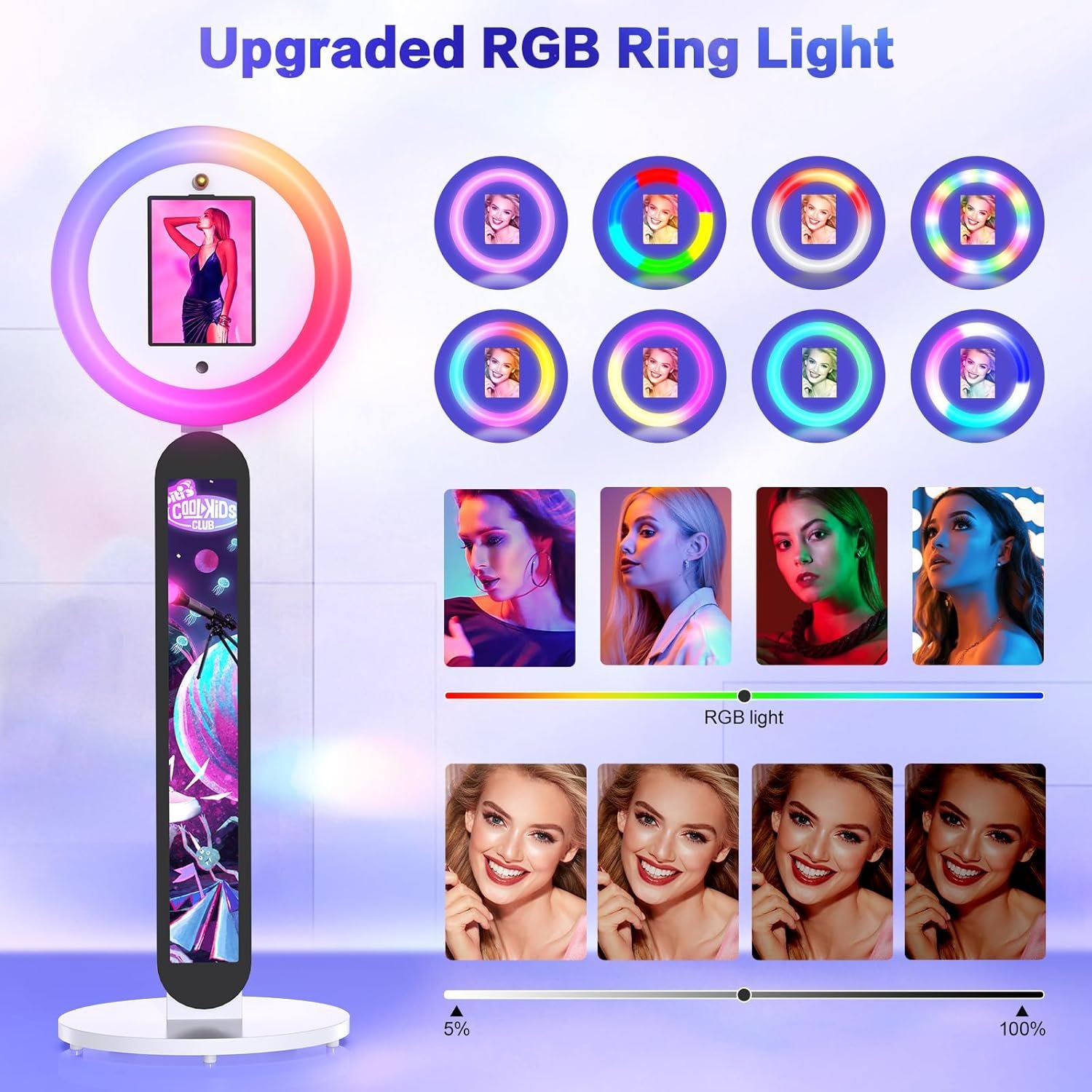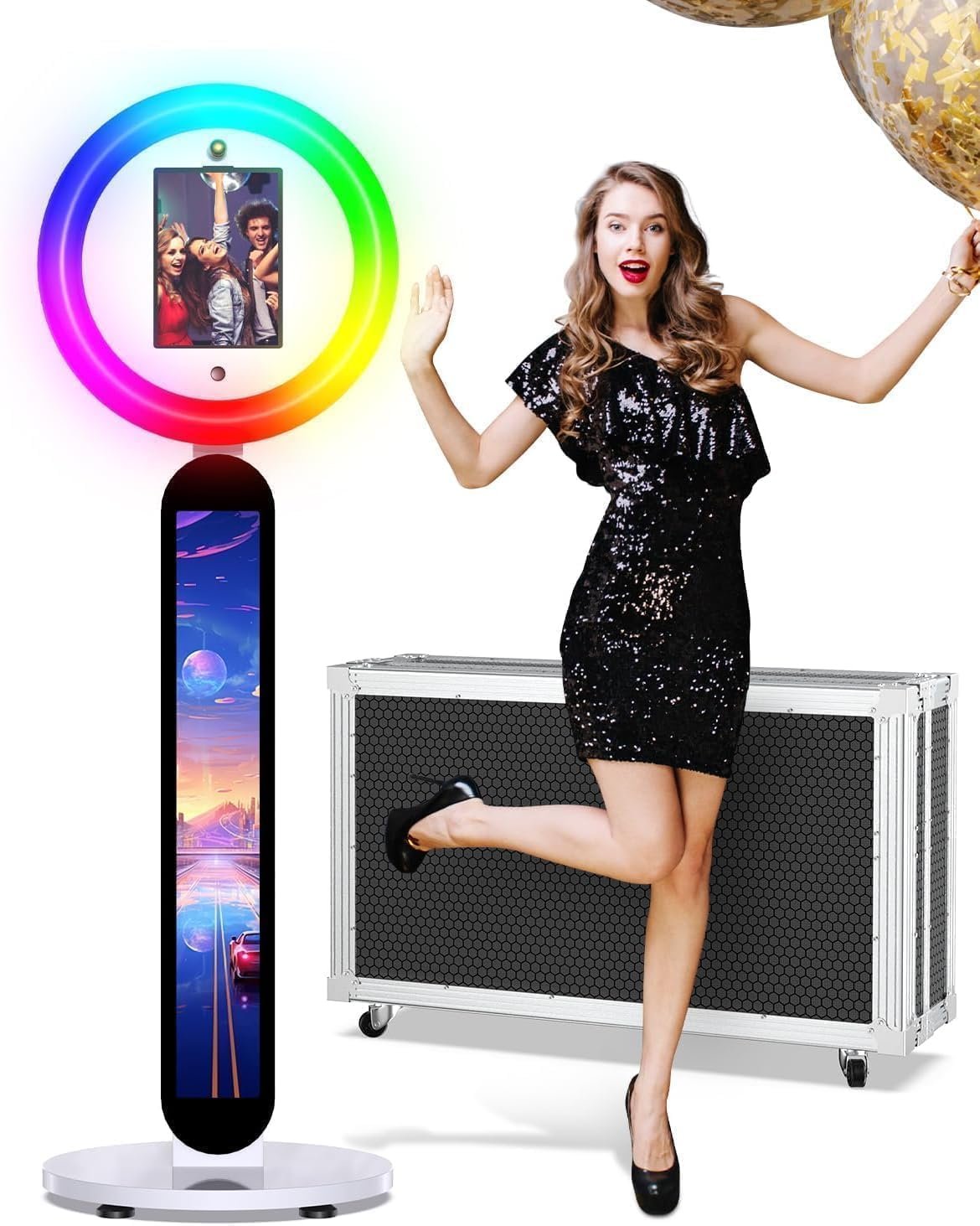 Portable Photo Booth Stand with App Control and Free Custom Logo, RGB Light Ring, Fits 10.2″, 10.9″, 12.9″ i Pads, Includes Protective Flight Case for Wedding Birthday