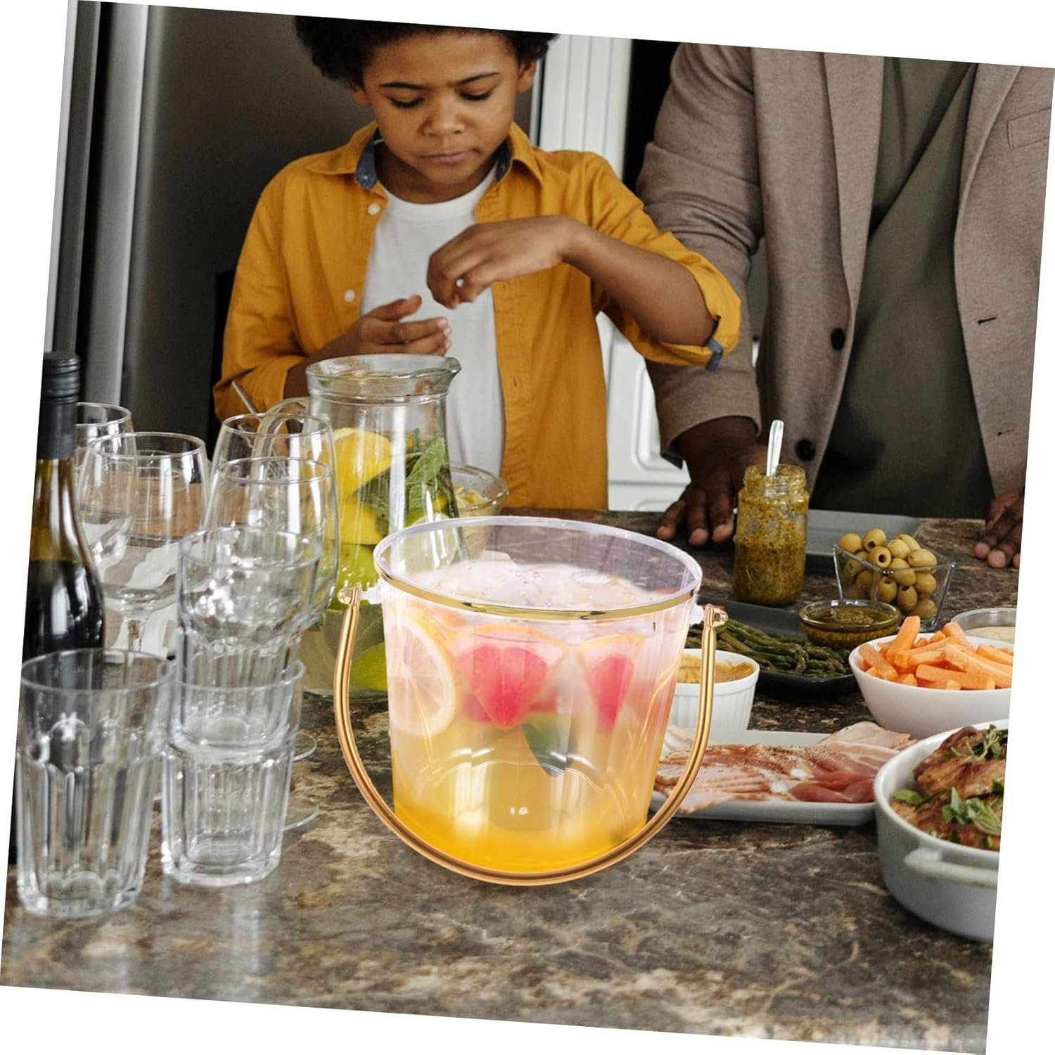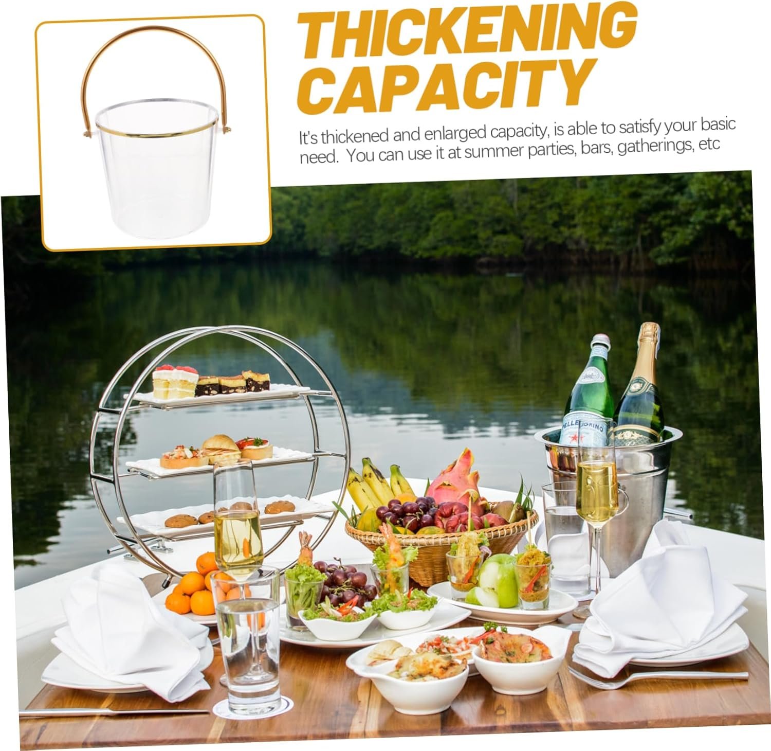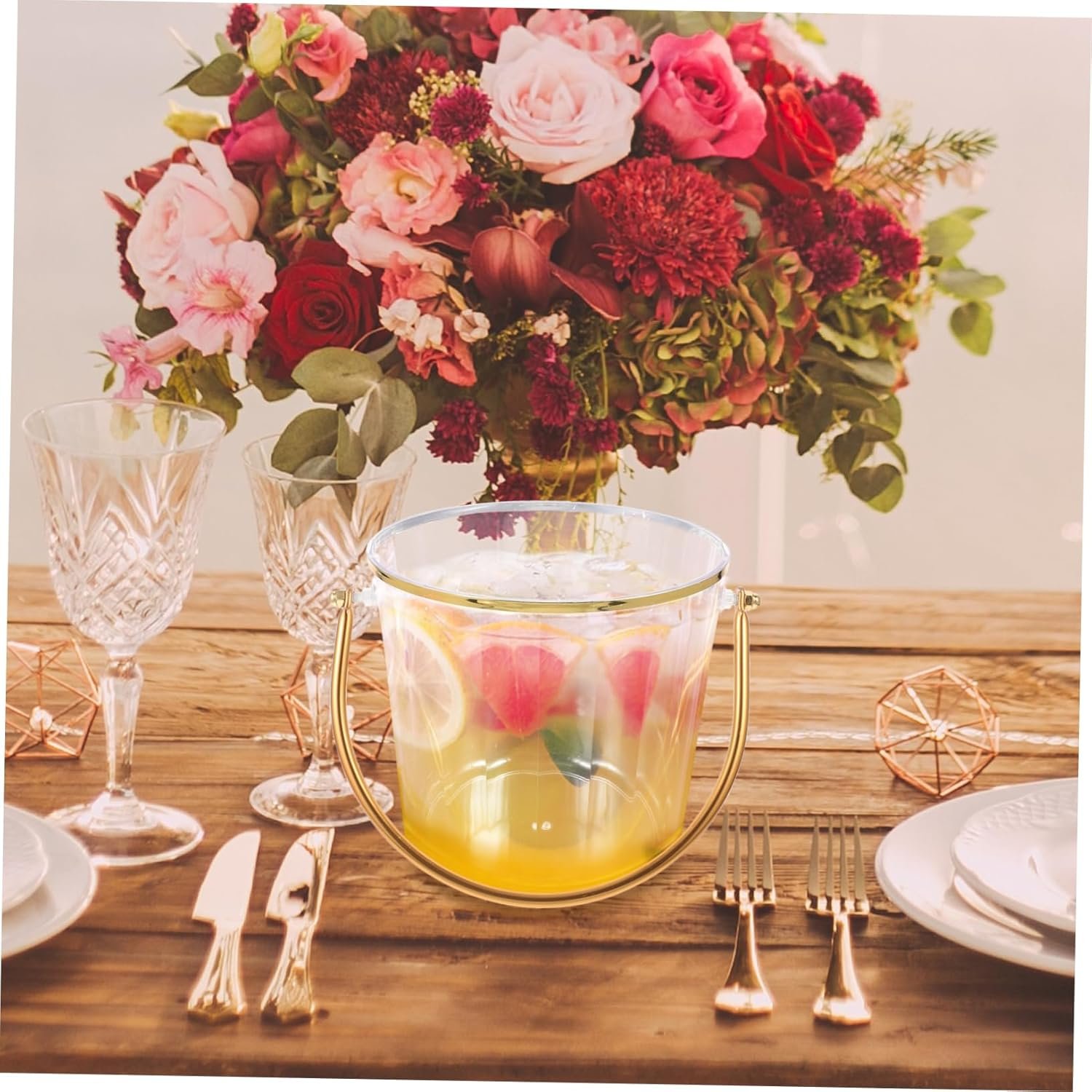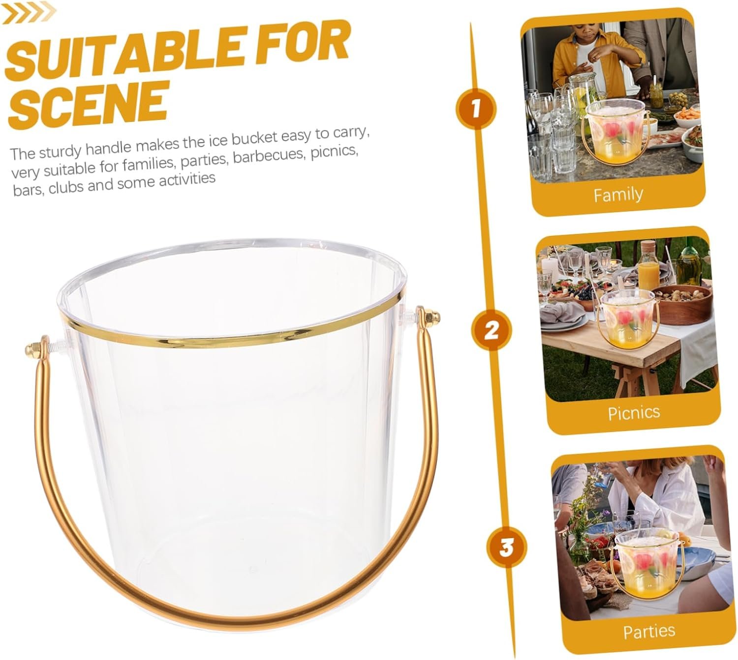 This versatile ice bucket is made of durable plastic in a transparent design, measuring 16.00×15.50×13.50cm. Ideal for various settings like homes, restaurants, bars, and parties, it effectively keeps beverages like beer and wine chilled. The bucket features comfortable handles for easy transport and is easy to clean. Its stylish appearance complements various decor styles, making it suitable for both indoor and outdoor use. Additionally, it can accommodate snacks and other items, making it a practical choice for gatherings and events.