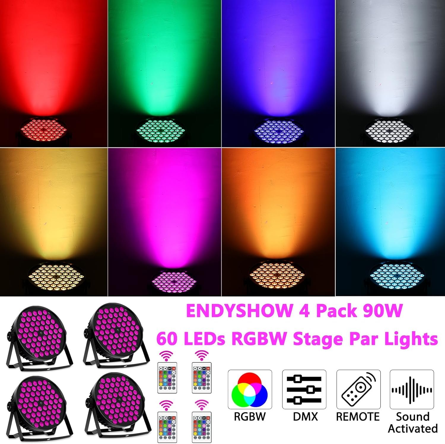 The ENDYSHOW 4Pack Stage Par Lights feature 60 ultra-bright RGBW LED beads, providing stunning illumination for various events like parties, weddings, and concerts. Constructed from durable ABS plastic and metal, these lights are sturdy and easy to install, offering multiple control modes, including DMX, sound activation, and remote control. Each light has a power of 90W, ensuring bright and vibrant colors. Ideal for diverse settings, these par lights are user-friendly and designed to create an exceptional ambiance for any occasion.