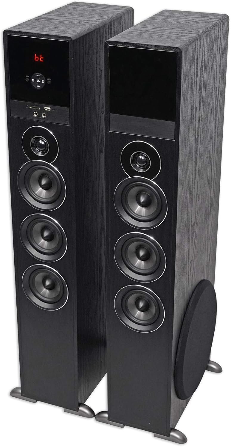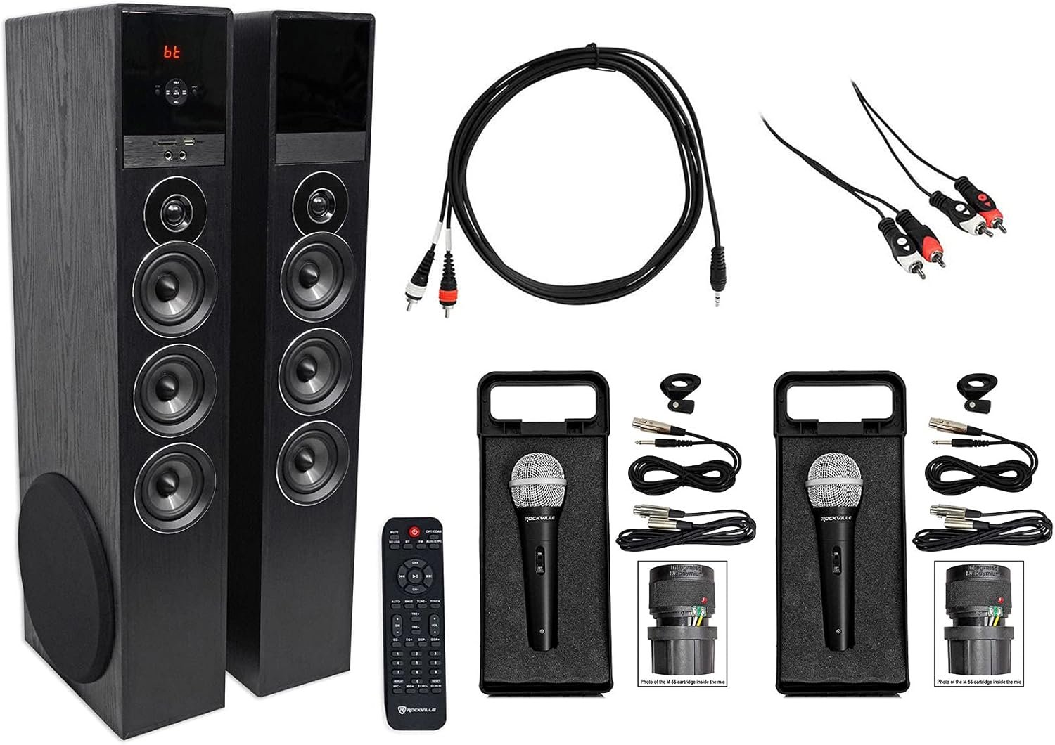 The Rockville All-in-One Bluetooth Home Theater/Karaoke Machine System includes a TM150B Tower Speaker system with dual 10″ subwoofers, Bluetooth connectivity, USB/SD playback, and an FM radio. It has a peak power of 1000 Watts, built-in equalizers, and multiple inputs. The package also features high-quality audio cables (RNRMR10 and RCDR10B) made from 100% copper for optimal signal transfer. Two Rockville RMC-XLR handheld microphones provide excellent sound quality. Designed for superior performance, this system offers deep bass and clear highs, making it ideal for home audio and karaoke.