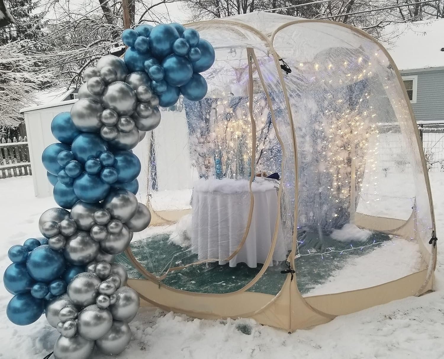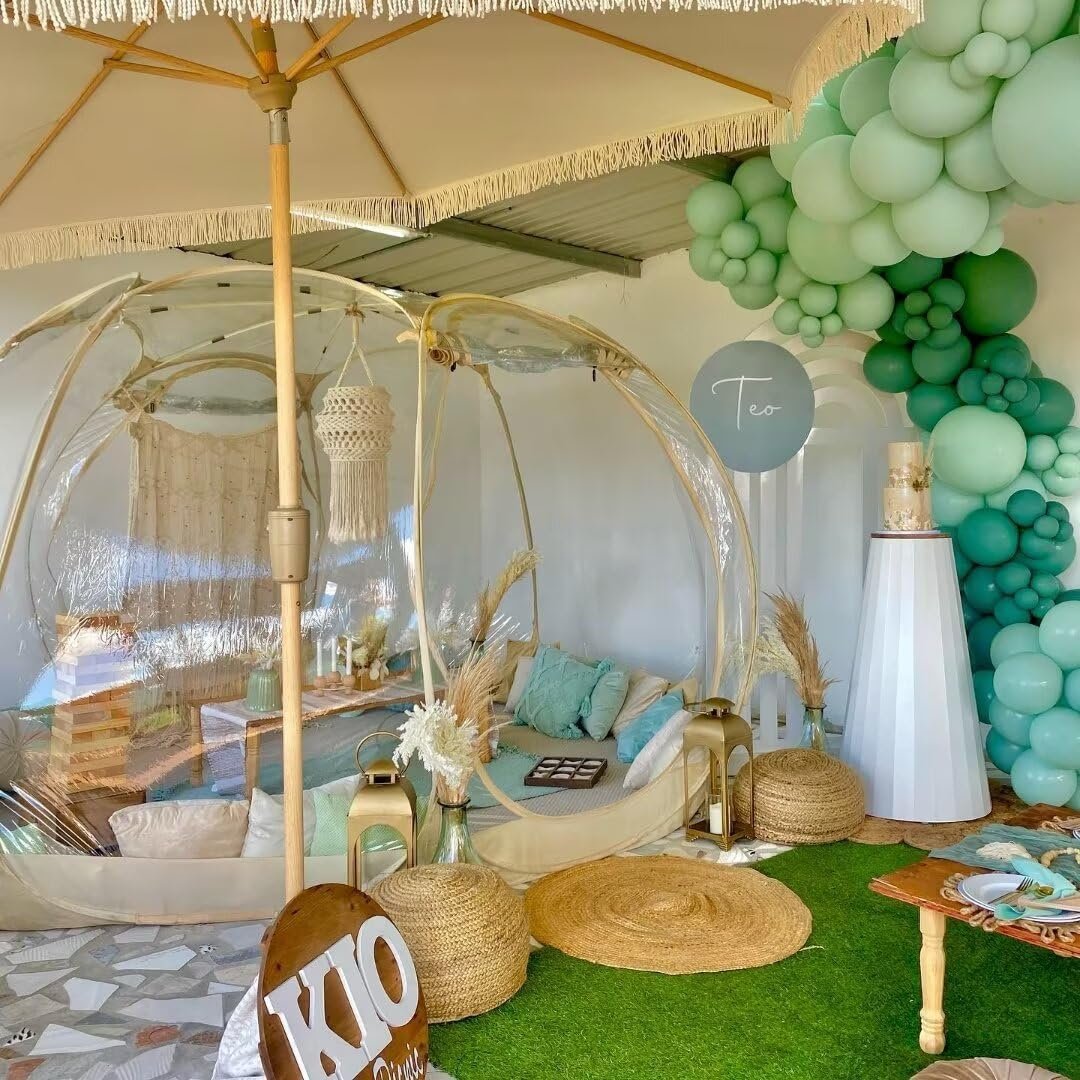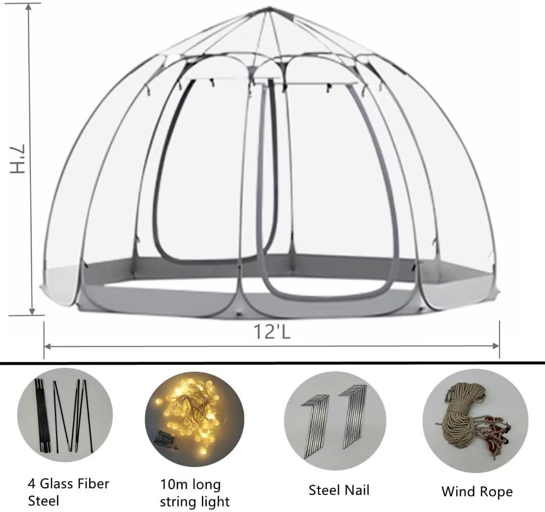 The bubble dome tent is versatile for garden planting, outdoor parties, dining, and storage, suitable for soft or wooden floors. Designed for 8-10 adults, it features a spacious 12’x12’x7’H interior, two large zippered entrances, and breathable windows for ventilation. Made from carbon fiber, it allows for quick pop-up assembly and easy transport, folding into a compact 1m diameter and weighing 10kg. With a 540-degree view and included accessories like fiberglass supports and stakes, it’s ideal for outdoor gatherings and experiences.