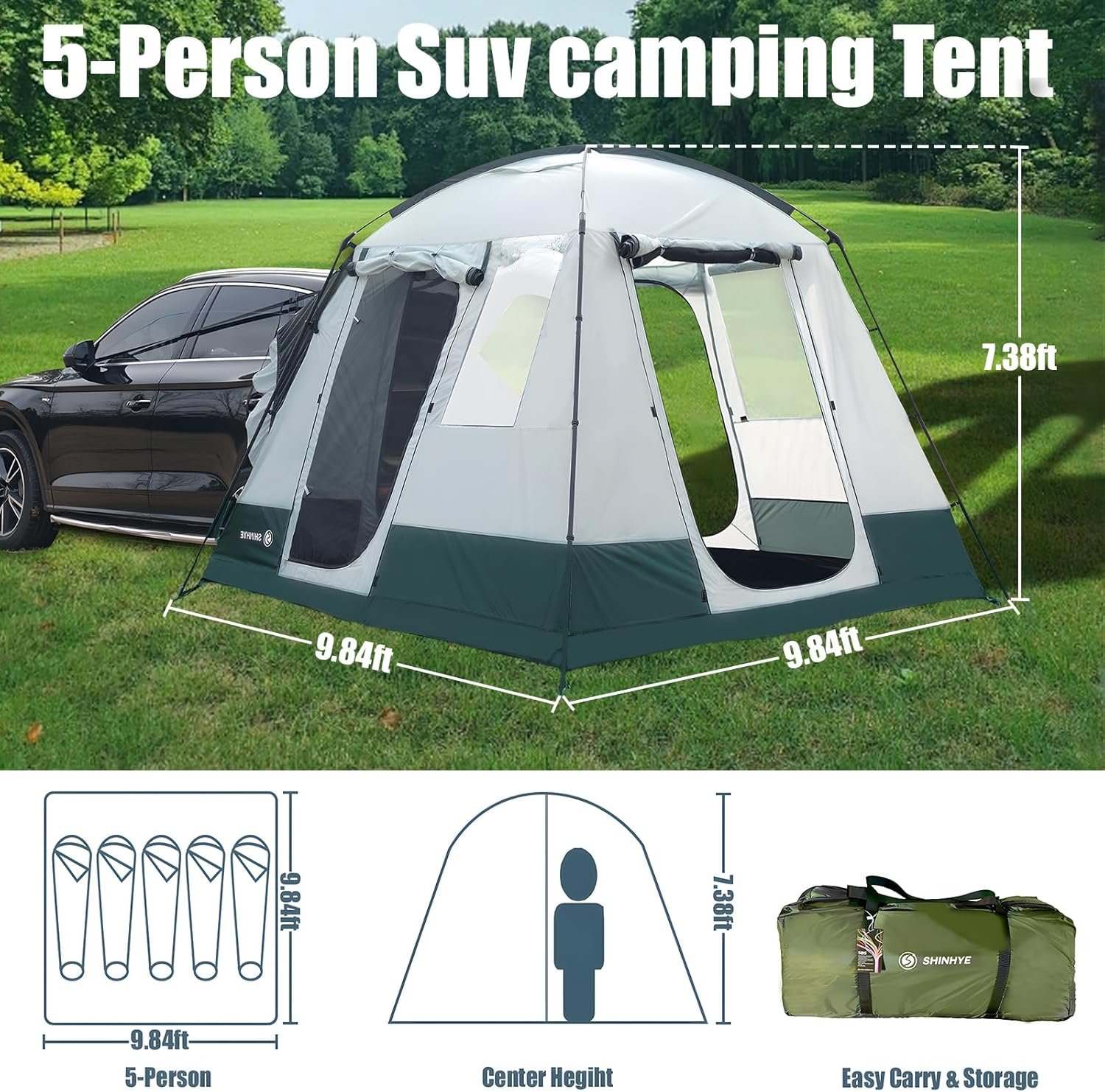 The SUV tent offers a spacious interior (9.84’ W x 9.84’ L x 7.38’ H) suitable for family camping. Made from waterproof 210T polyester with a PU10000mm-coated bottom, it ensures durability against rain. The tent connects seamlessly to your vehicle for added sleeping and storage space, while TPU windows enhance ventilation and views. It can also function as a standalone tent, compatible with various vehicles like SUVs and hatchbacks. The compact 26-inch storage bag makes it easy to carry.
