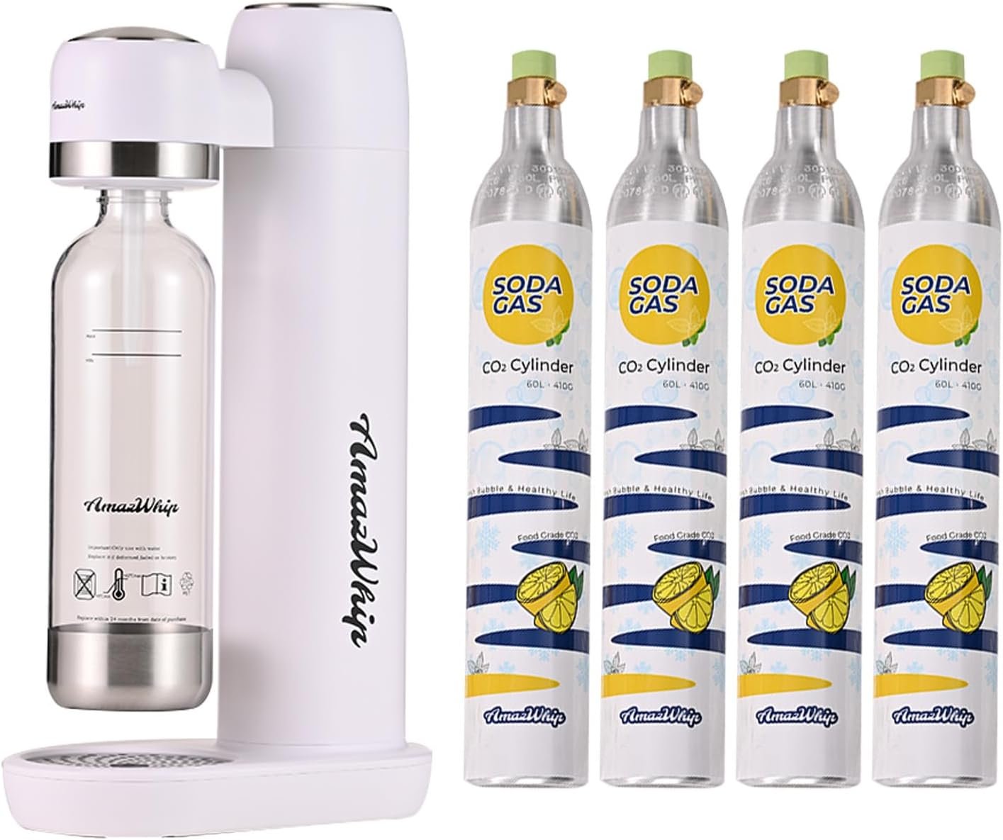 The AmazWhip 60L CO2 gas cylinder features a threaded connector and is compatible with various soda makers. To create fizzy water, press the soda maker for 3-5 seconds. This product is sugar-free, calorie-free, and additive-free, ideal for health-conscious users. It employs advanced gas intake technology for improved bubble solubility and includes a durable, food-grade PET pressure bottle. One cylinder produces 40-60L of sparkling water, promoting sustainability and reducing plastic waste. The package includes four CO2 carbonators, making it an economical choice for sparkling water enthusiasts.