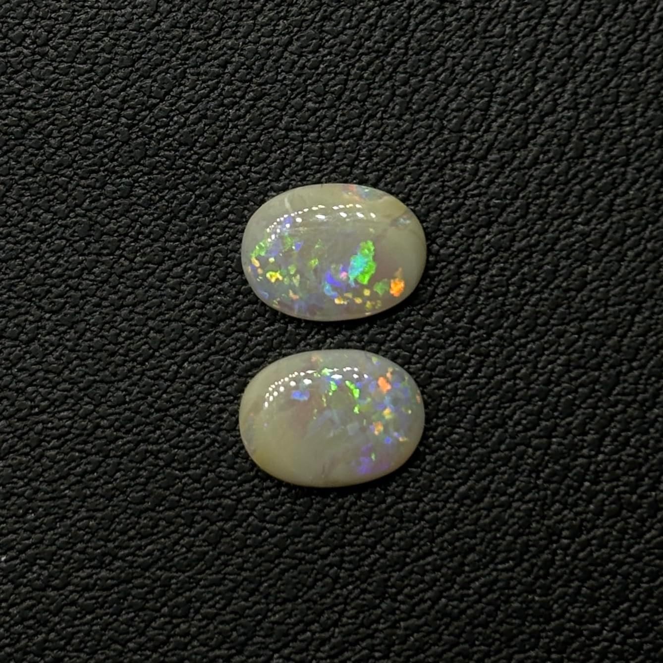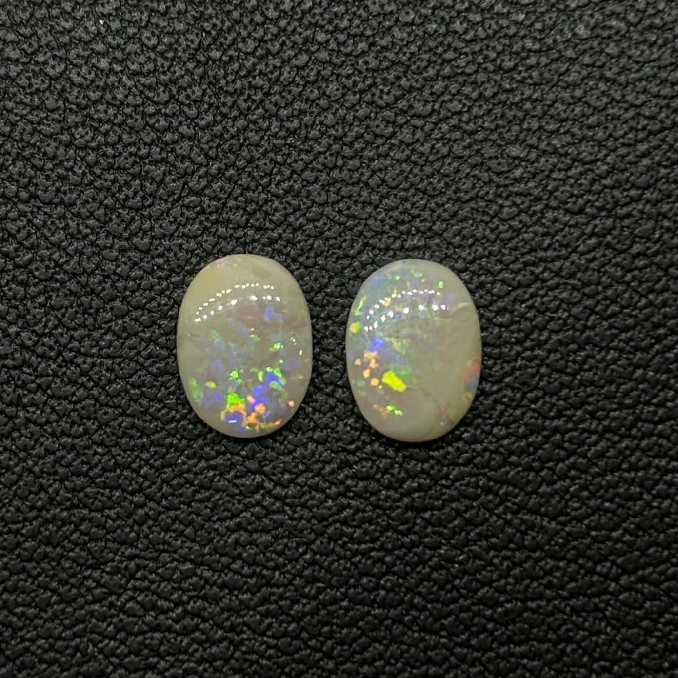 A stunning pair of colorful opals from Lightning Ridge, Australia, available for setting. These light type opals weigh 0.90 carats and are cut in an oval shape, measuring 7mm x 5mm x 2mm each. Featuring a stalk and confetti pattern, they have a brightness rating of B3. The product was first available on July 1, 2025, and includes warranty information. ASIN: B0FG8H64RP.