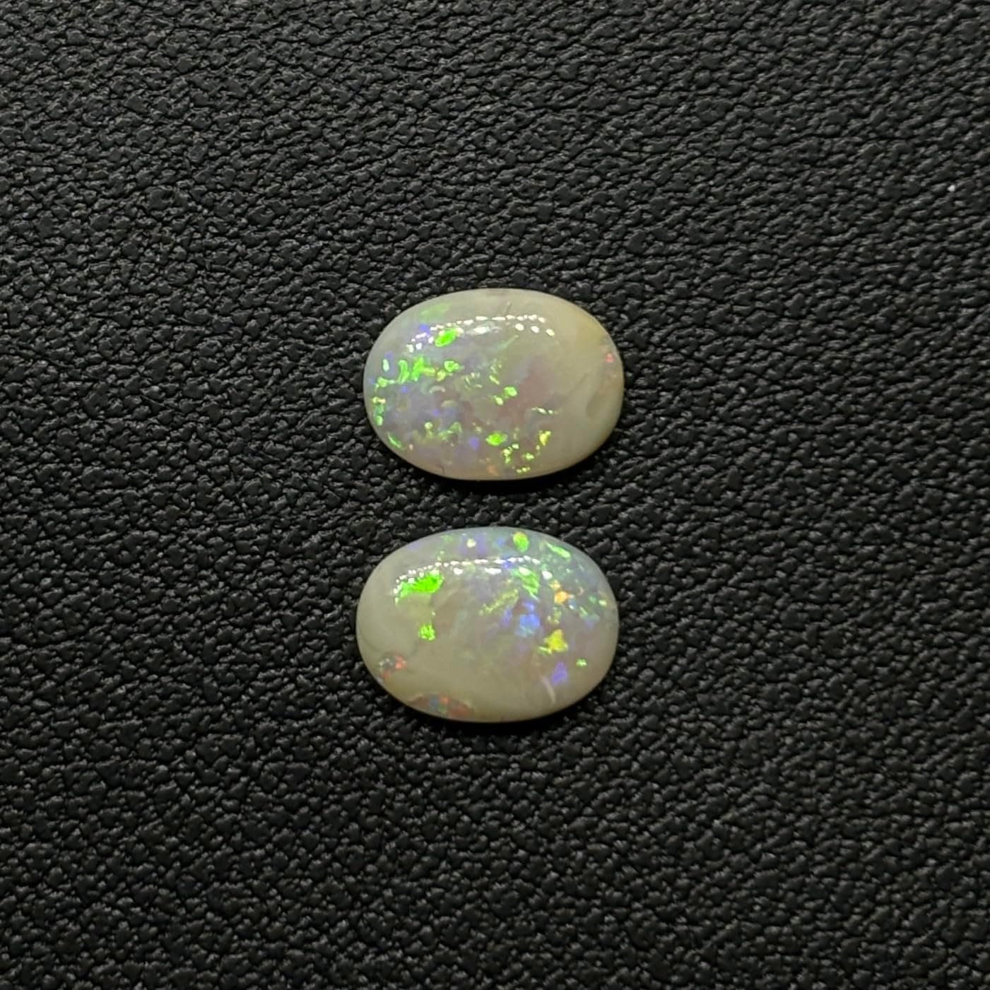 Discover a stunning pair of colorful opals from Lightning Ridge, Australia. These oval-cut stones, weighing 0.90 cts, exhibit vibrant stalk and confetti patterns. Brightness rated B3, they are perfectly polished and ready to be set in your next exquisite piece.