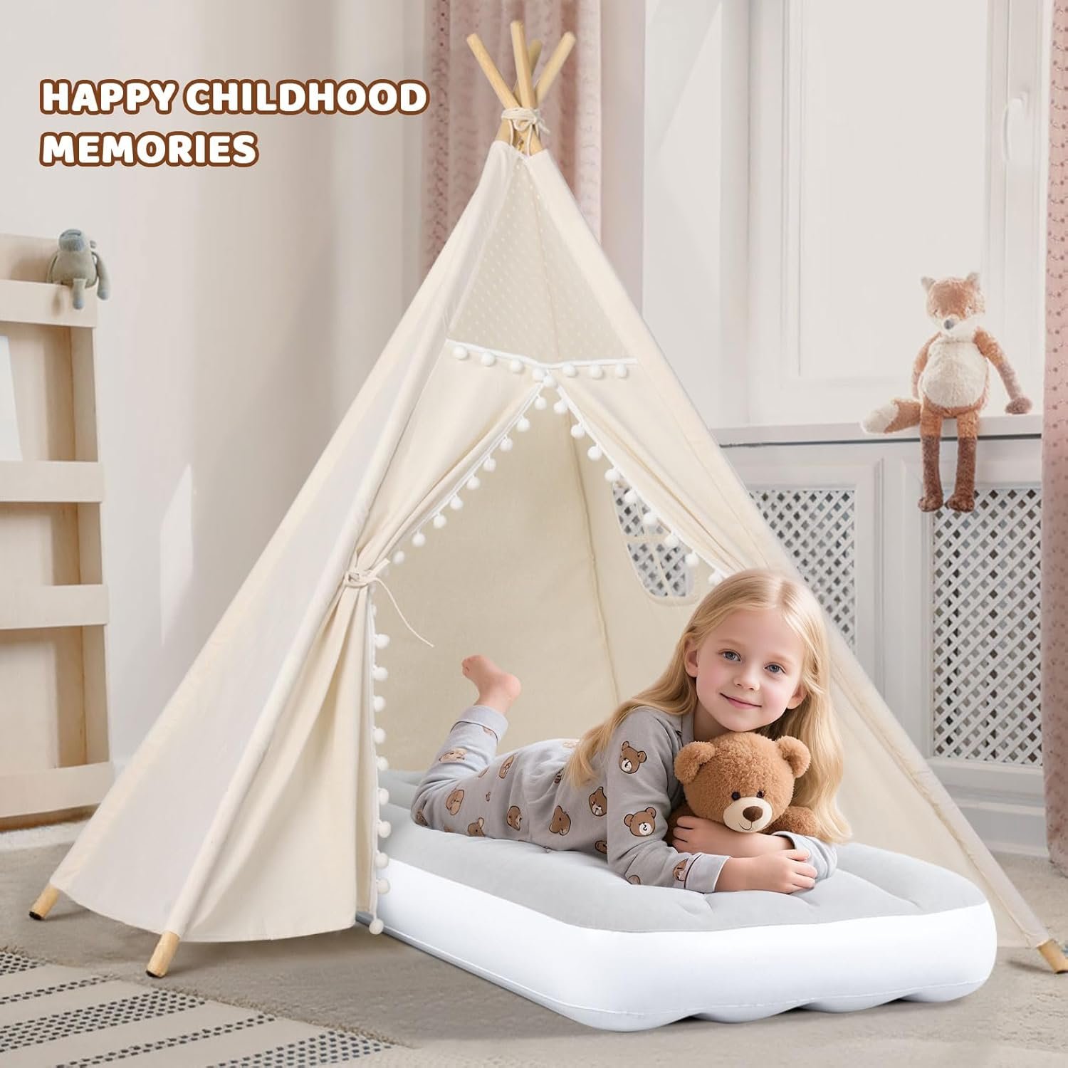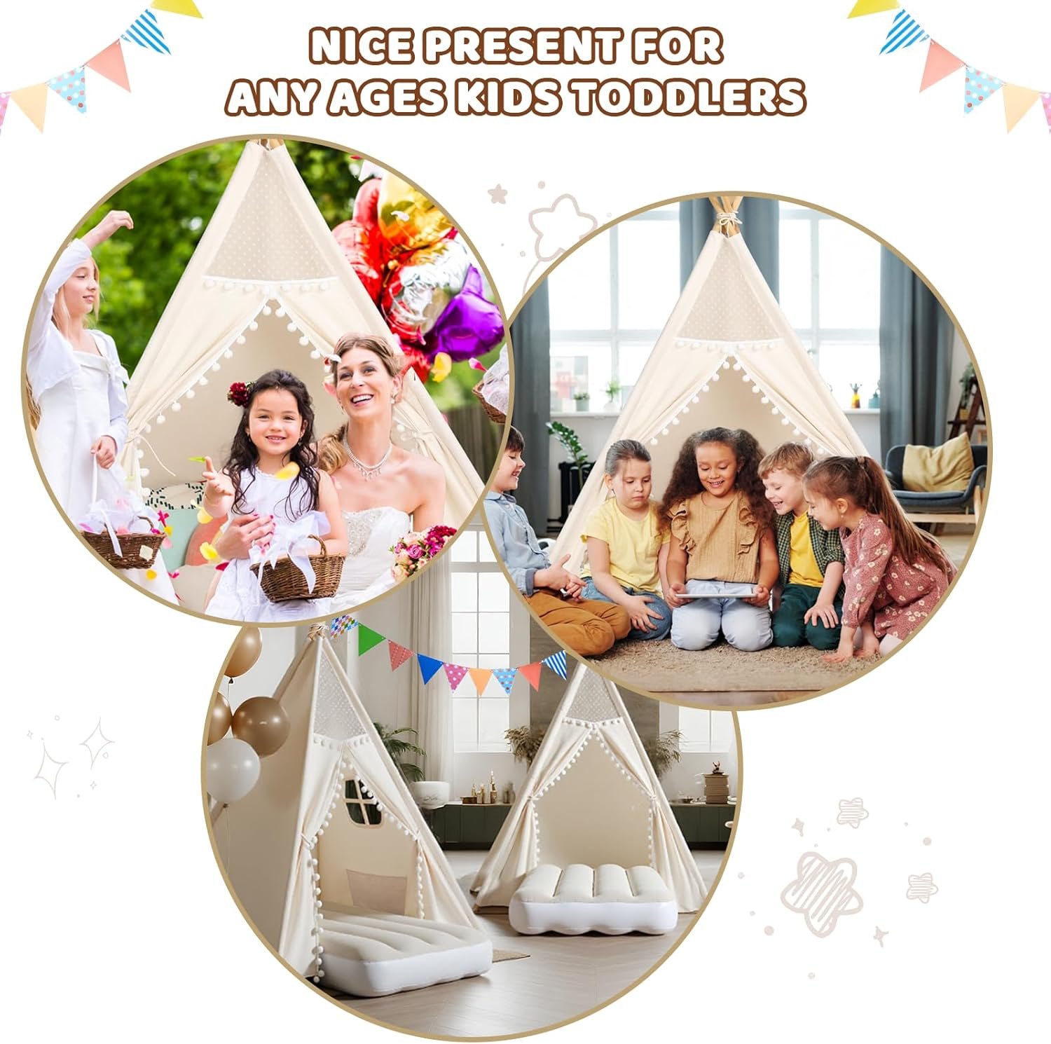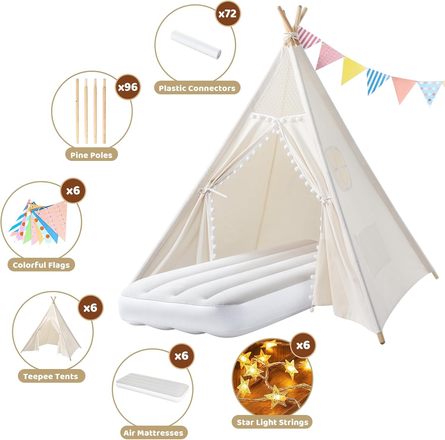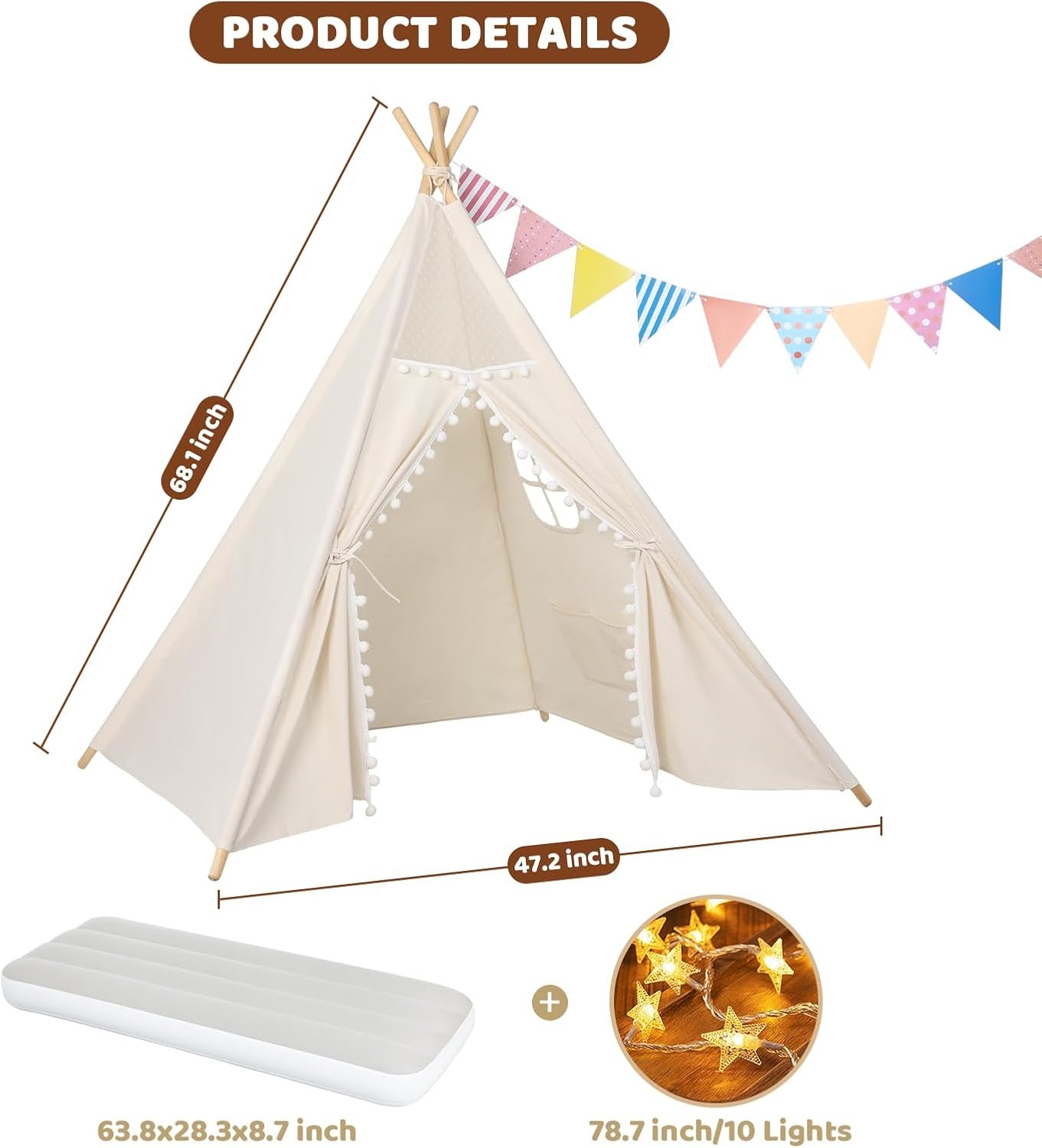 The Sumbababy Twin Kids Teepee Set offers double the fun with two matching boho-style tents, featuring 6 tents, light strings, and decorative flags. Crafted from durable fabric and solid pine poles, the set is ideal for siblings or friends. It includes inflatable airbeds for comfort and storage pockets for organization. Quick to set up, the tents are perfect for parties, indoor reading, or backyard camping. Packaged in a carry bag for easy transport, this set makes a wonderful gift for birthdays or Christmas, ensuring magical playtime experiences for children.