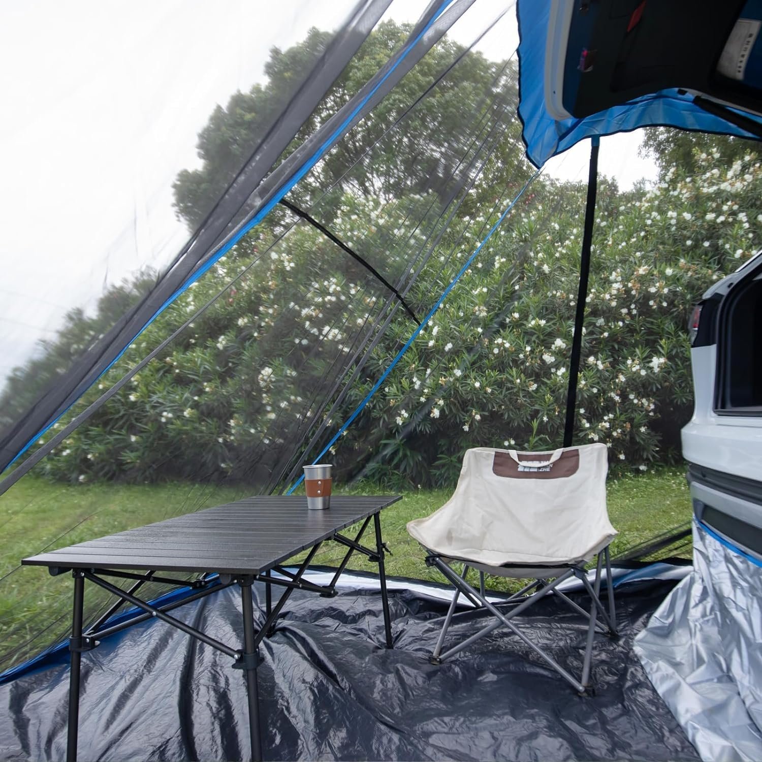 The SUV Tent for Camping features easy installation with a convenient hook design, spacious dimensions (245x200x220 cm), and accommodates up to 4 people. Made from solid waterproof 210D Oxford fabric, it remains dry in heavy rain and includes a mesh door to keep bugs out. The tent is versatile, fitting most SUVs and hatchbacks, and offers a durable, high-quality design suitable for various outdoor conditions. Its double-sided zipper enhances functionality, ensuring it withstands wear while providing ample ventilation. Ideal for campers seeking comfort and protection from the elements.