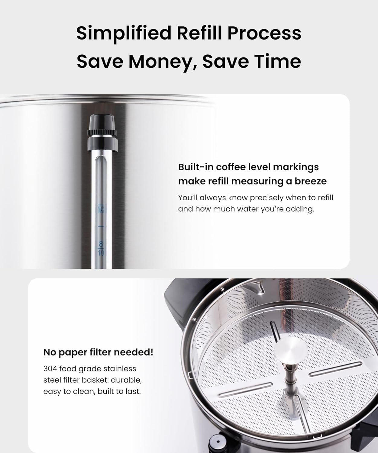 Customers find the coffee maker keeps drinks hot for hours and is great for big gatherings, with a durable stainless steel build and generous 100-cup capacity. The machine is easy to clean, looks sleek, and delivers high-quality results.