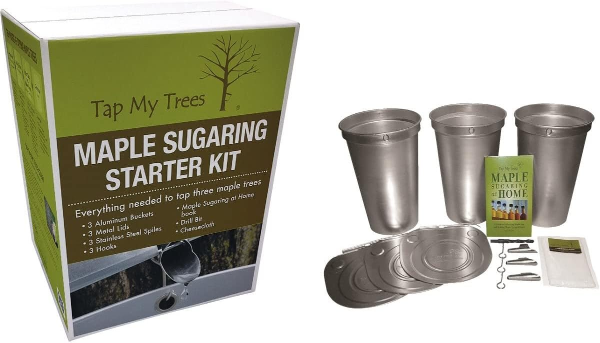 The TAP MY TREES Maple Sugar Starter Kit provides all the essentials to tap three maple trees at home. It includes three metal buckets, lids, spiles, a drill bit, cheesecloth, and the “Maple Sugaring at Home” book. This eco-friendly process of collecting maple sap is accessible to anyone with a healthy, mature maple tree.
