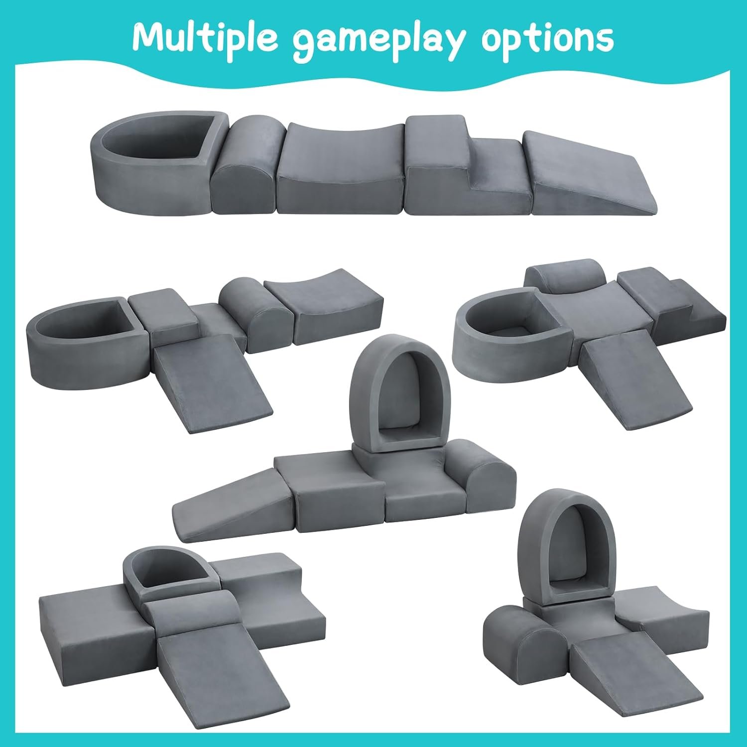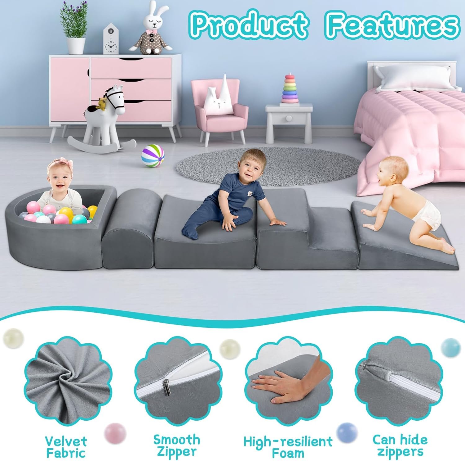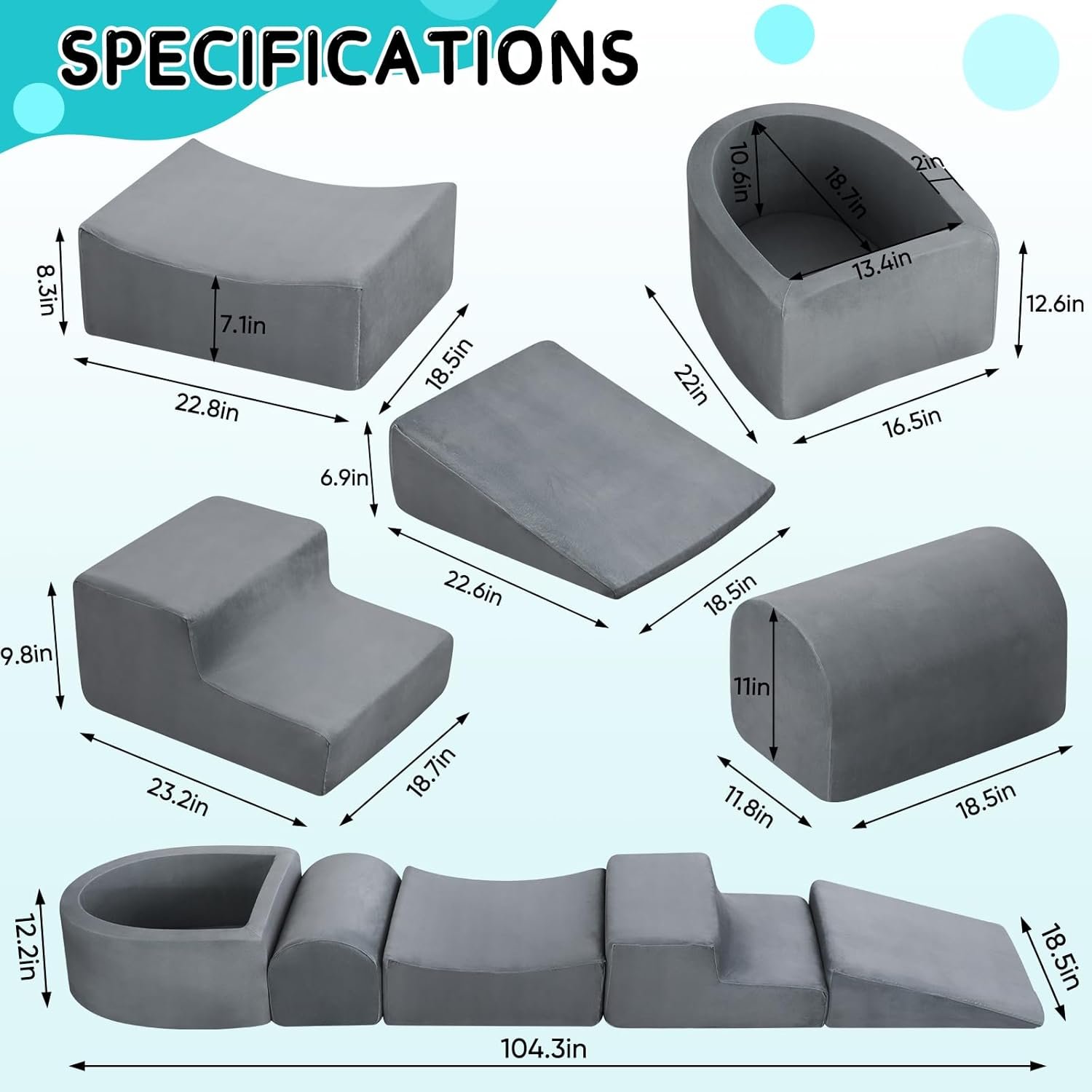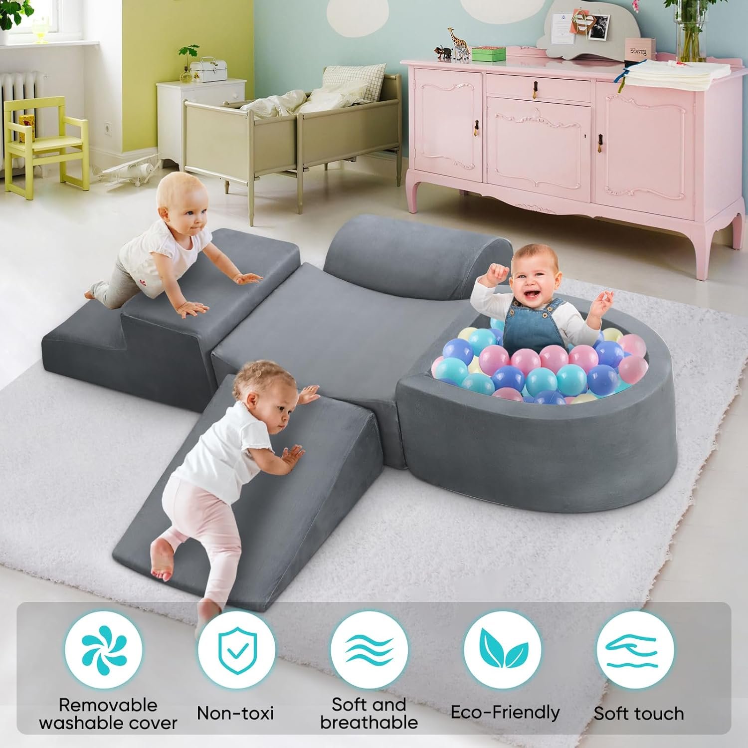The Foam Play Set includes five shapes and blocks, inspiring toddlers’ creativity, imagination, and motor skills through climbing and play. Made of soft plush fabric with hidden zippers, the high-density sponge supports safe crawling, climbing, and sliding. Easily machine washable, it serves as a versatile play mat, ball pit, or fort. Ideal for indoor play, the set promotes exploration and fun for children of all ages. Note that the blocks arrive vacuum sealed; unzip and allow 48 hours for them to fully expand.