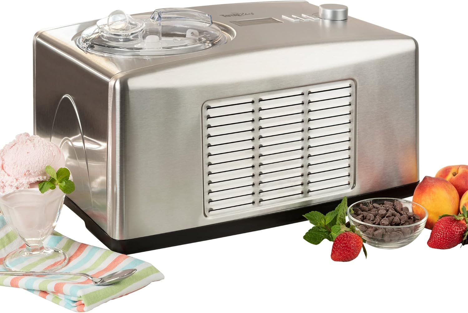 The Total Chef Automatic 2-in-1 Ice Cream & Yogurt Maker simplifies dessert preparation with an automatic process, accommodating both individual and larger servings. Its 1.6-quart capacity, adjustable fermentation times, and compatibility with various ingredients allow for personalized creations. The unit features pre-set modes, an LCD display, and a quick preparation capability, making frozen treats in under an hour. Additionally, it includes a motor self-protection mode and a compact design for easy storage. A 1-year limited warranty ensures peace of mind for users.