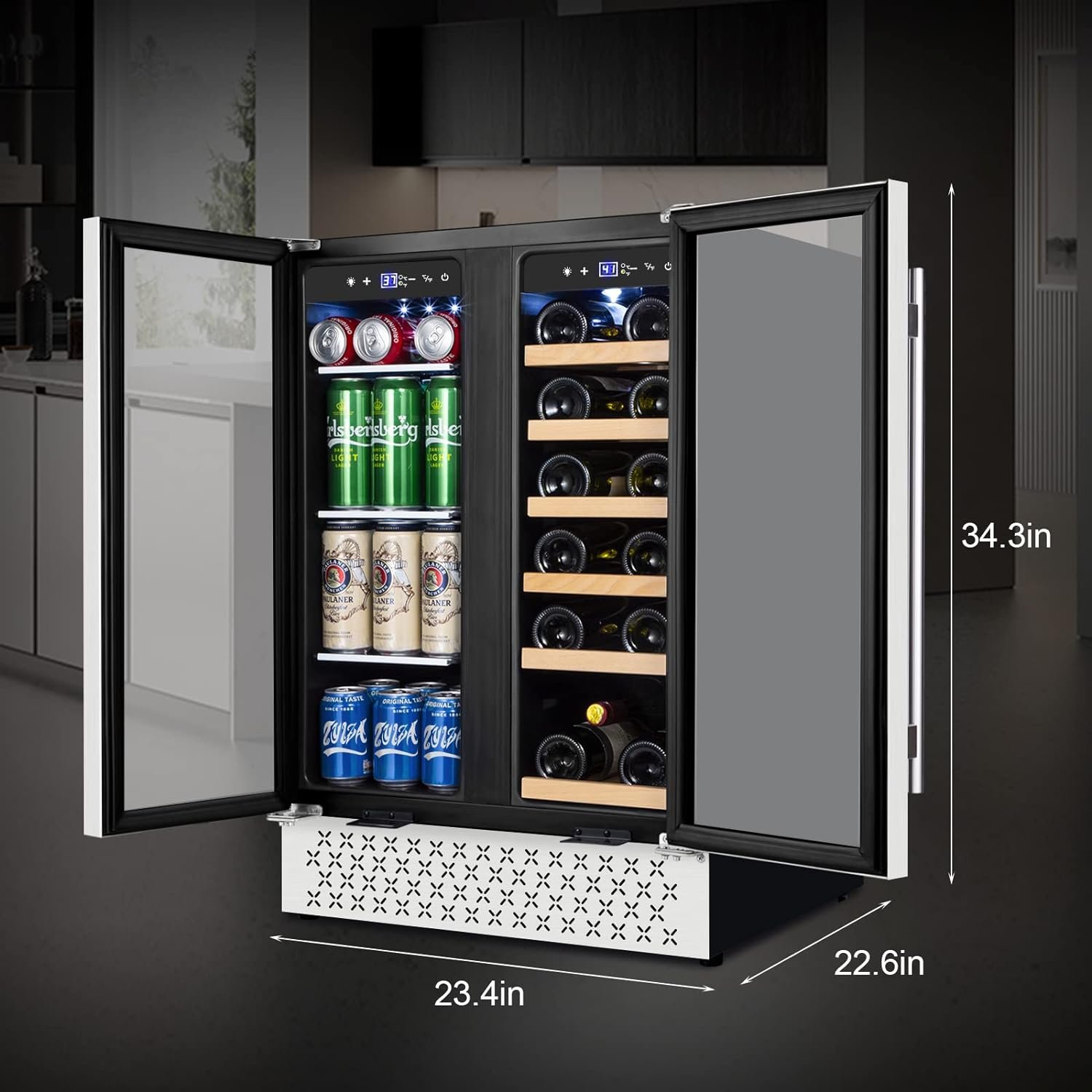 The TYLZA Dual Zone Wine and Beverage Refrigerator features independent cooling zones for optimal temperature control, capable of holding 18 wine bottles and 57 cans. Its powerful, quiet cooling system ensures stable conditions with low vibration. The fridge includes a touch screen for easy temperature adjustments, a white LED light, and an auto-defrost function. Built with double tempered glass doors and security locks, it can be used as a built-in or freestanding unit. With energy-saving features and a seamless design, it keeps your beverages preserved perfectly. Rated 4.4 to 4.5 stars by customers.