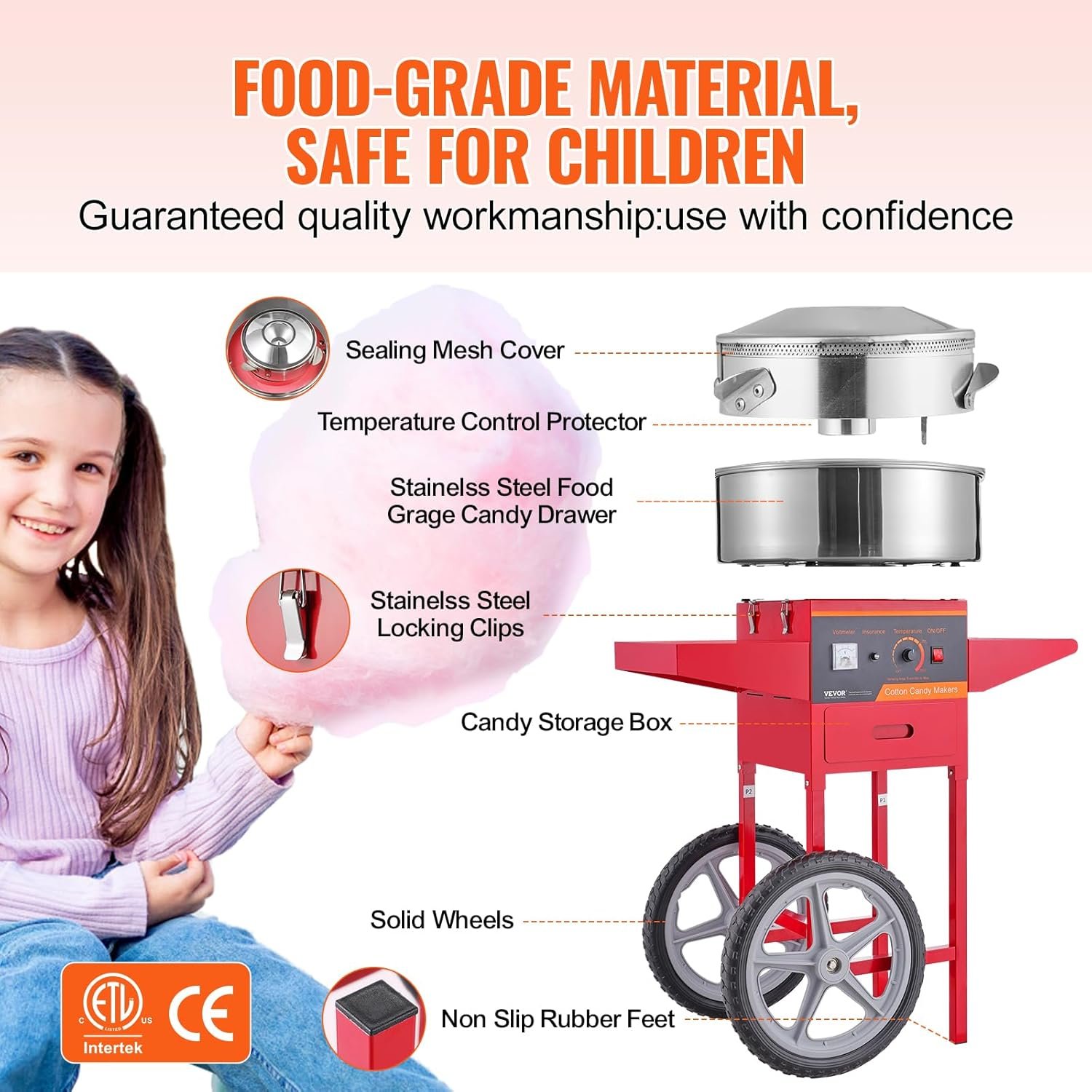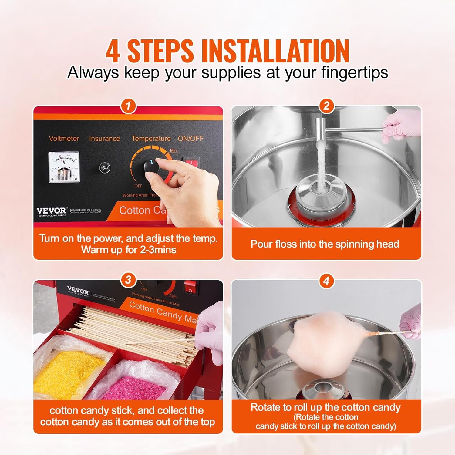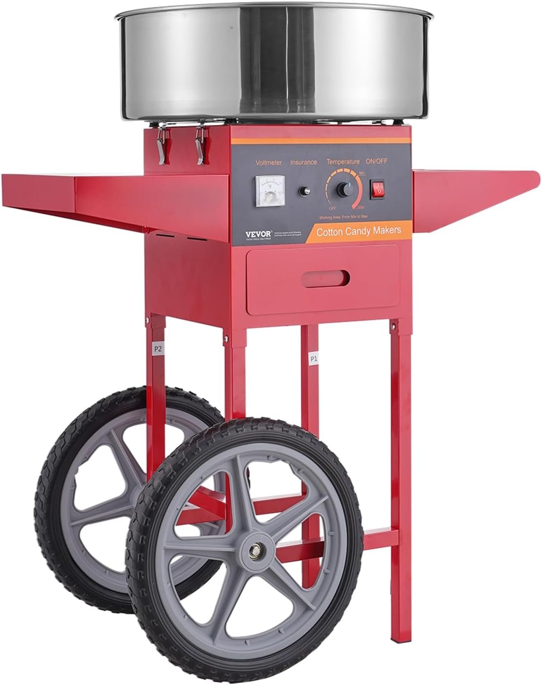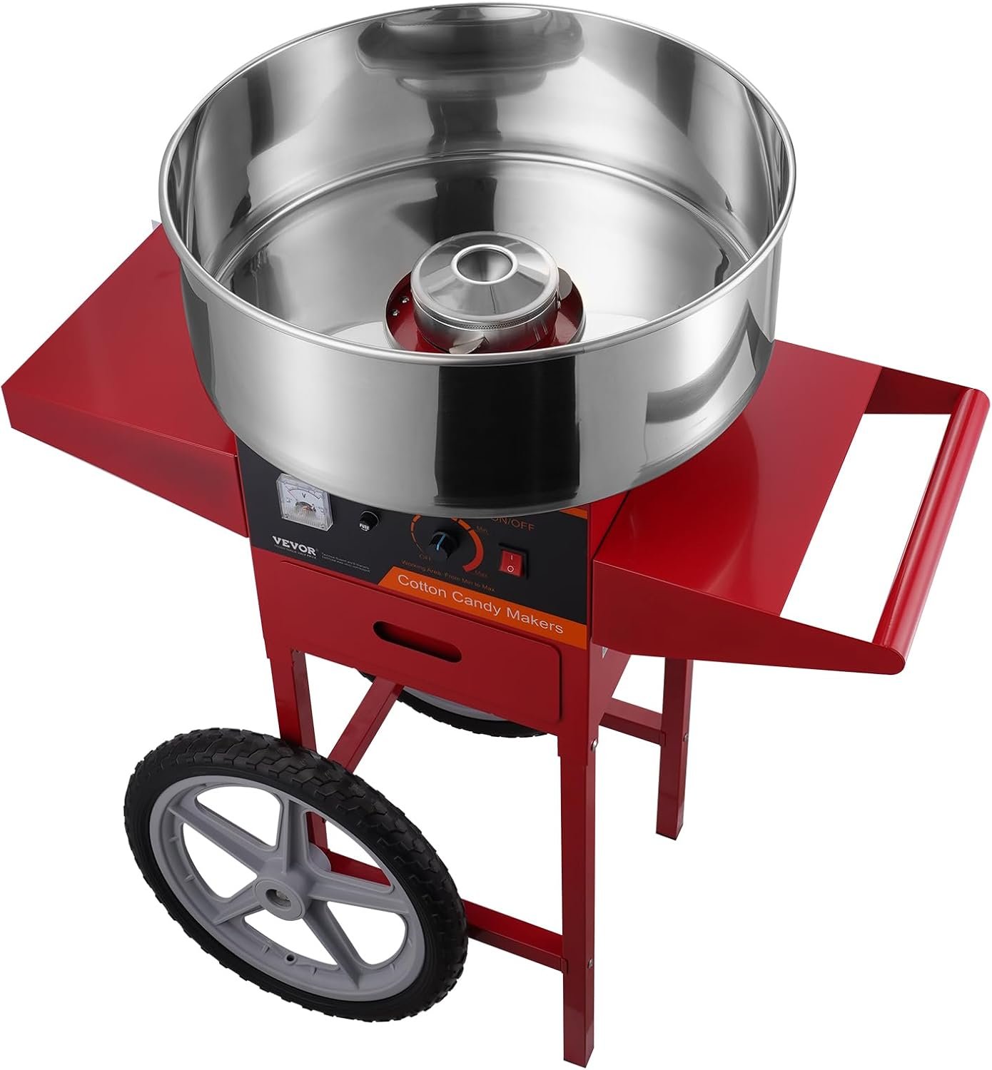 The VEVOR Electric Cotton Candy Machine features a larger sugar bowl that produces up to six cotton candy cones per minute, enabling one-hour continuous operation without interruptions. It’s easy to operate, requiring just power on, temperature adjustment, and sugar pouring. The control panel allows precise temperature regulation (245°F to 439°F) and is compatible with various sugar types for colorful, flavored cotton candy. Ideal for festivals, parties, and gatherings, this machine has earned a 4.3-star rating from 384 reviews. It retails at $179.53 and includes a cart for convenience.