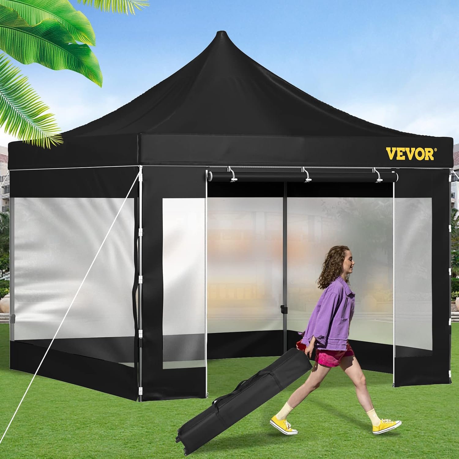 The 10×10 ft pop-up canopy tent assembles in just one minute and provides 200 sq ft of space for 8-10 people. It features three adjustable height settings, a maximum height of over 9 ft, and is made from durable, all-season 500D PU-coated fabric offering UPF 50+ protection. With removable sidewalls, it creates a greenhouse effect for year-round use, and transparent windows ensure visibility. Quick and easy to set up, it’s ideal for winter storage, gatherings, and outdoor activities. The package includes a frame, canopy cover, sidewalls, storage bag, stakes, and a manual.