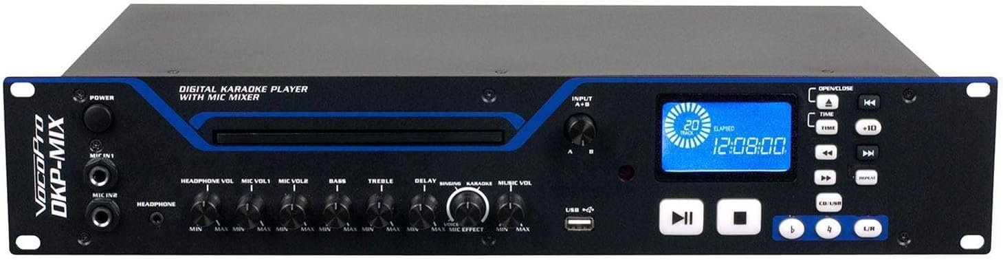 This device features a fully-functional remote, USB reader for digital files, and is NTSC/PAL switchable for global compatibility. It supports multi-format playback, including DVD, VCD, and MP3, with both single and repeat modes. Designed for portability, it includes dual microphone inputs with volume controls, a built-in echo effect for enhanced vocals, and headphone jack control. Additionally, it offers 6.5-step digital key control for adjusting music pitch and individual RCA/XLR input/output jacks for versatile connectivity.