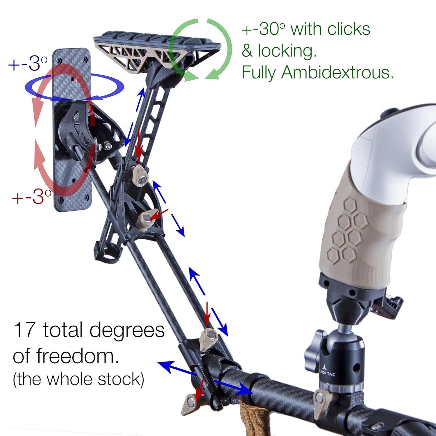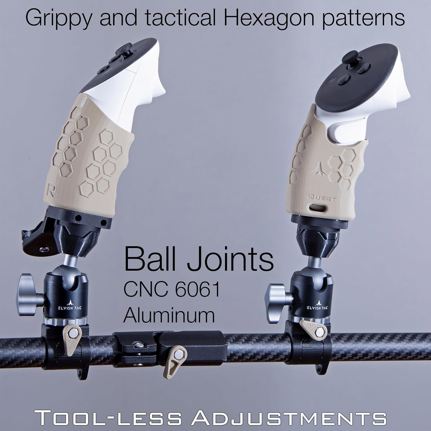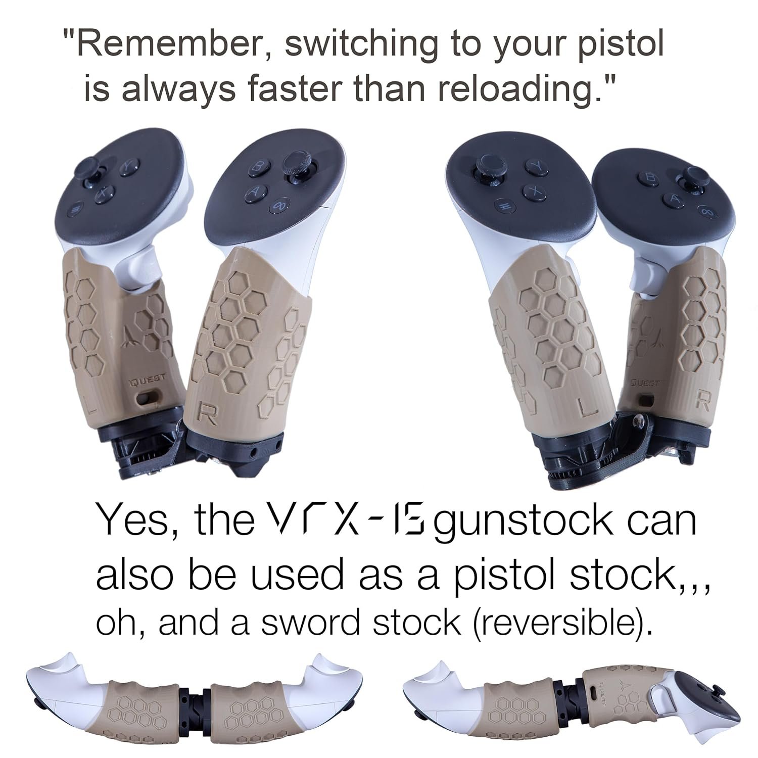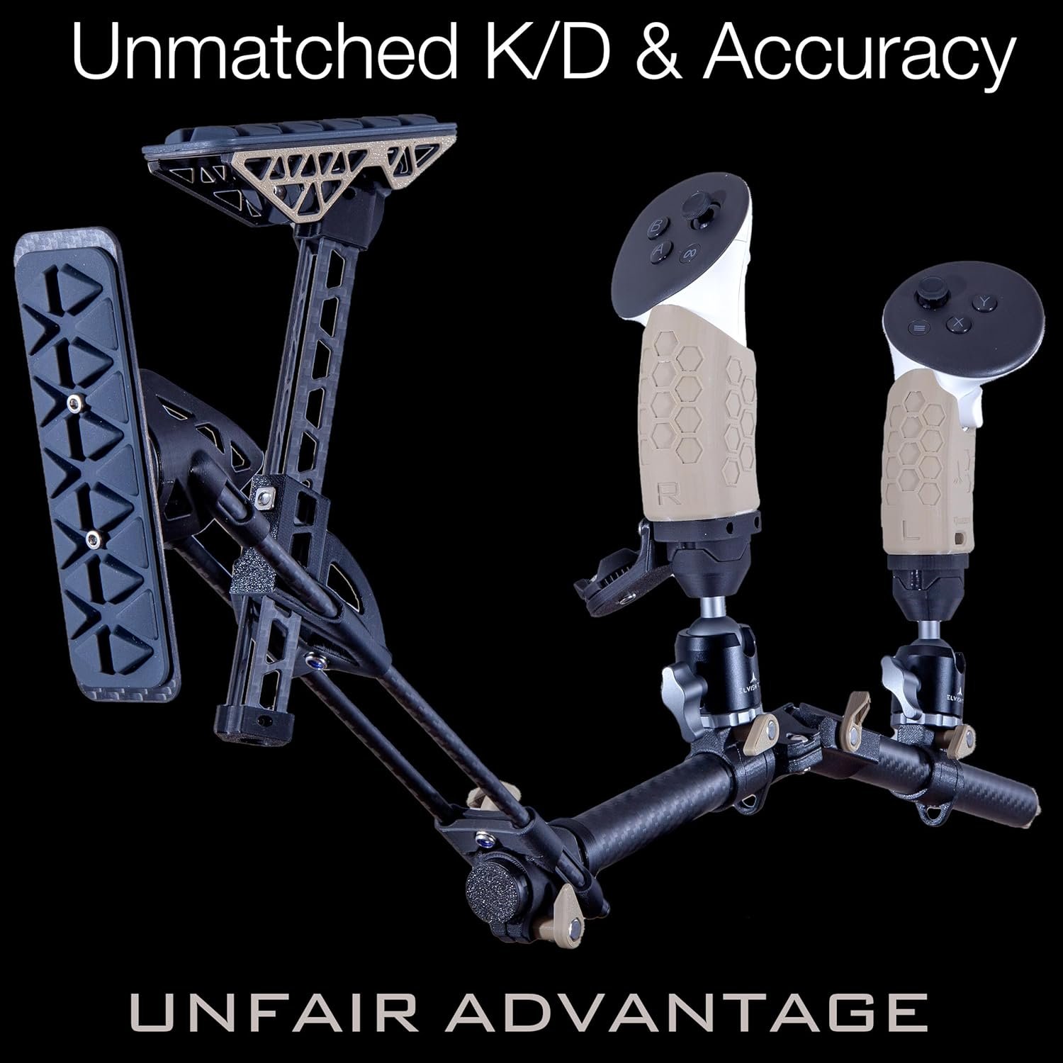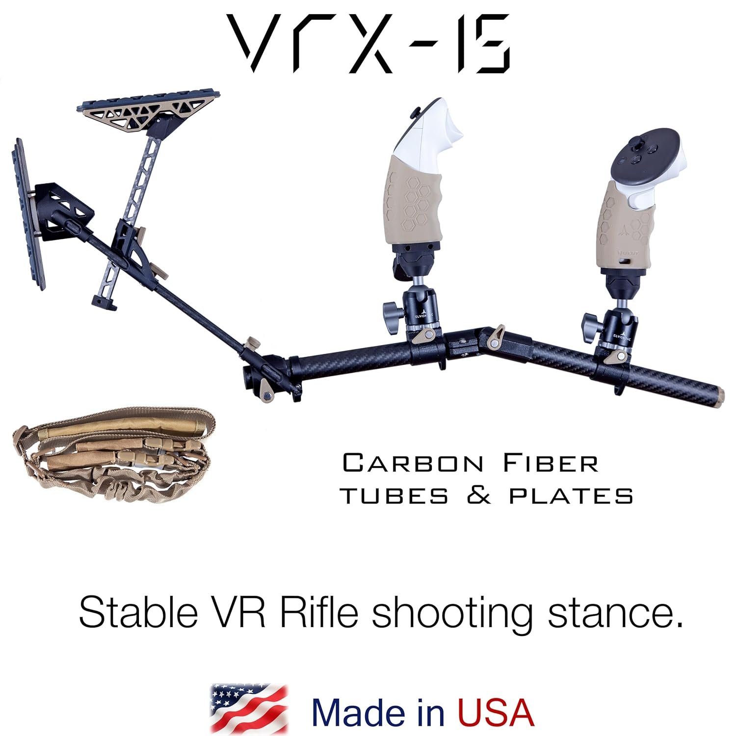 The VRX-15 stock enhances VR shooting by providing a rigid connection among the right hand, left hand, shoulder, and cheek, eliminating “floating hands” for a more immersive experience. It significantly boosts K/D and accuracy in games like Pavlov and Onward, offering users a competitive edge. Made from CNC aircraft aluminum with 17 degrees of freedom and tool-less adjustments, it includes custom Neodymium magnets for quick mag changes. A high-quality rifle sling is also included, allowing for versatile mounting options. Note: Quest controllers are not included.