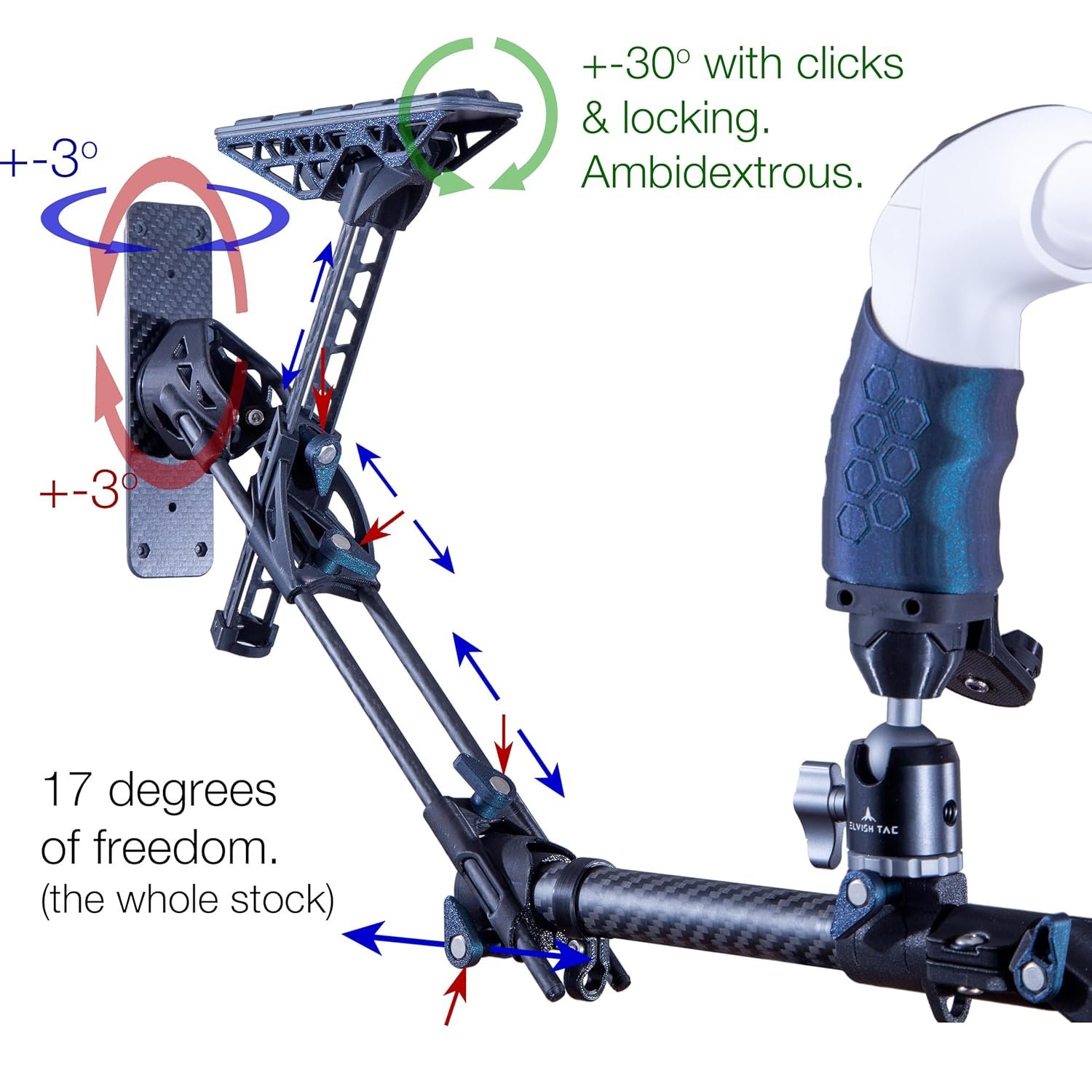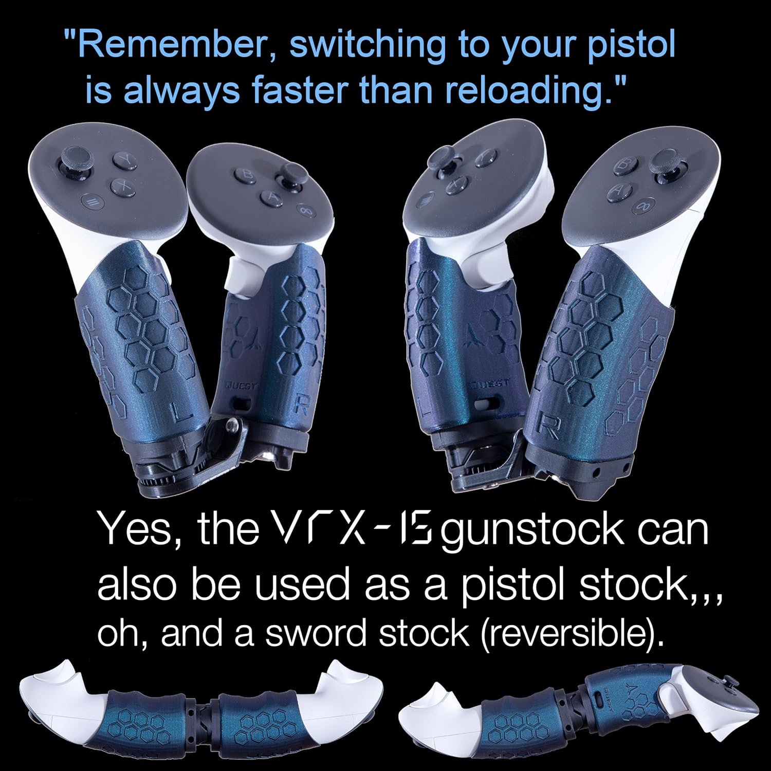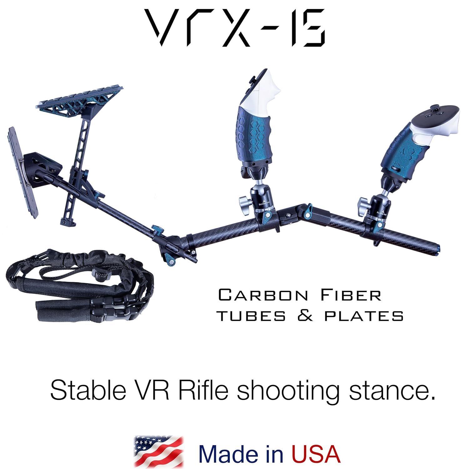 The VRX-15 stock enhances VR rifle shooting by providing a stable stance with a solid connection between the hands, shoulder, and cheek, improving realism and immersion in games like Pavlov and Onward. It offers customizable features with CNC aluminum ball joints and 17 degrees of freedom, allowing tool-less adjustments. Each stock is hand-made in the USA and includes strong Neodymium magnets for quick magazine changes. A high-quality rifle sling with four mounting points is also included, although Quest controllers are not part of the package, giving users a competitive edge in gameplay.