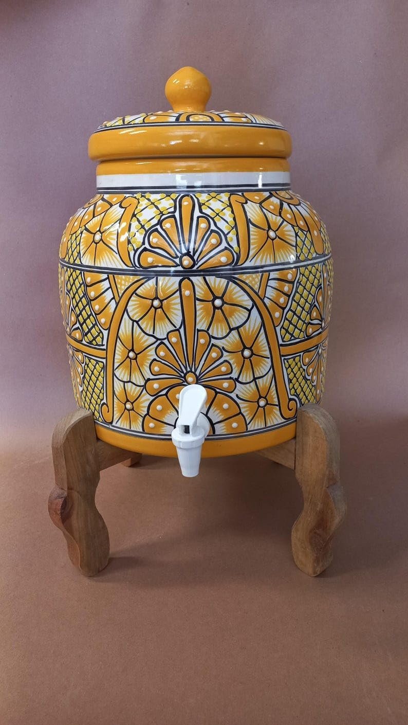 The AUTHENTIC TALAVERA handcrafted Mexican water dispenser showcases vibrant folk art designs by skilled artisans. It measures 11″ x 11″ x 13″, with a base of 11 ½” x 11 ½” x 7″, and stands 19 ½” tall, holding up to 3 ½ gallons—suitable for a 5-gallon jug on top. This gravity-fed dispenser serves water, lemonade, or other drinks, enhancing both functionality and decor in any setting. Each piece is uniquely crafted, making it a beautiful and versatile addition for indoor and outdoor gatherings, reflecting colorful Mexican artistry.