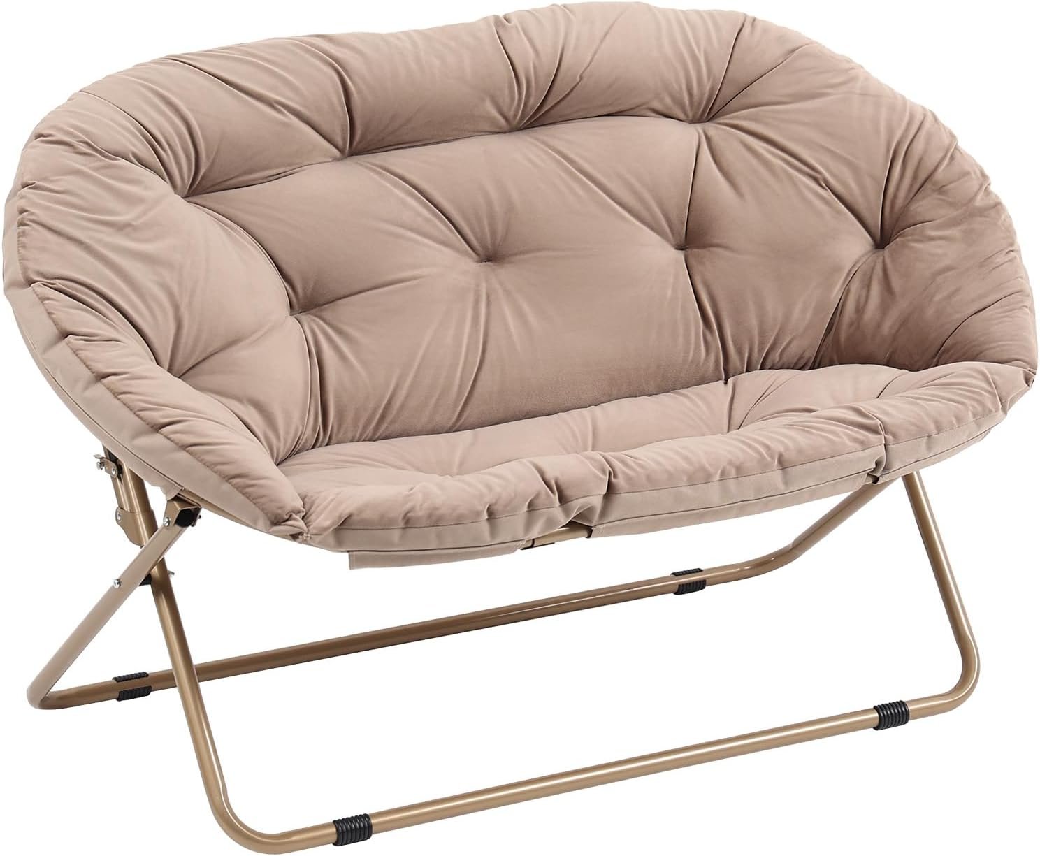 Welnow Comfy Double Saucer Chair Loveseat, Modern 2-Seat Folding Faux Fur Lounge Chair, Foldable Accent Reading Chair with Metal Frame Moon Chair for Bedroom, Living Room, Dorm Rooms, Dutch Khaki