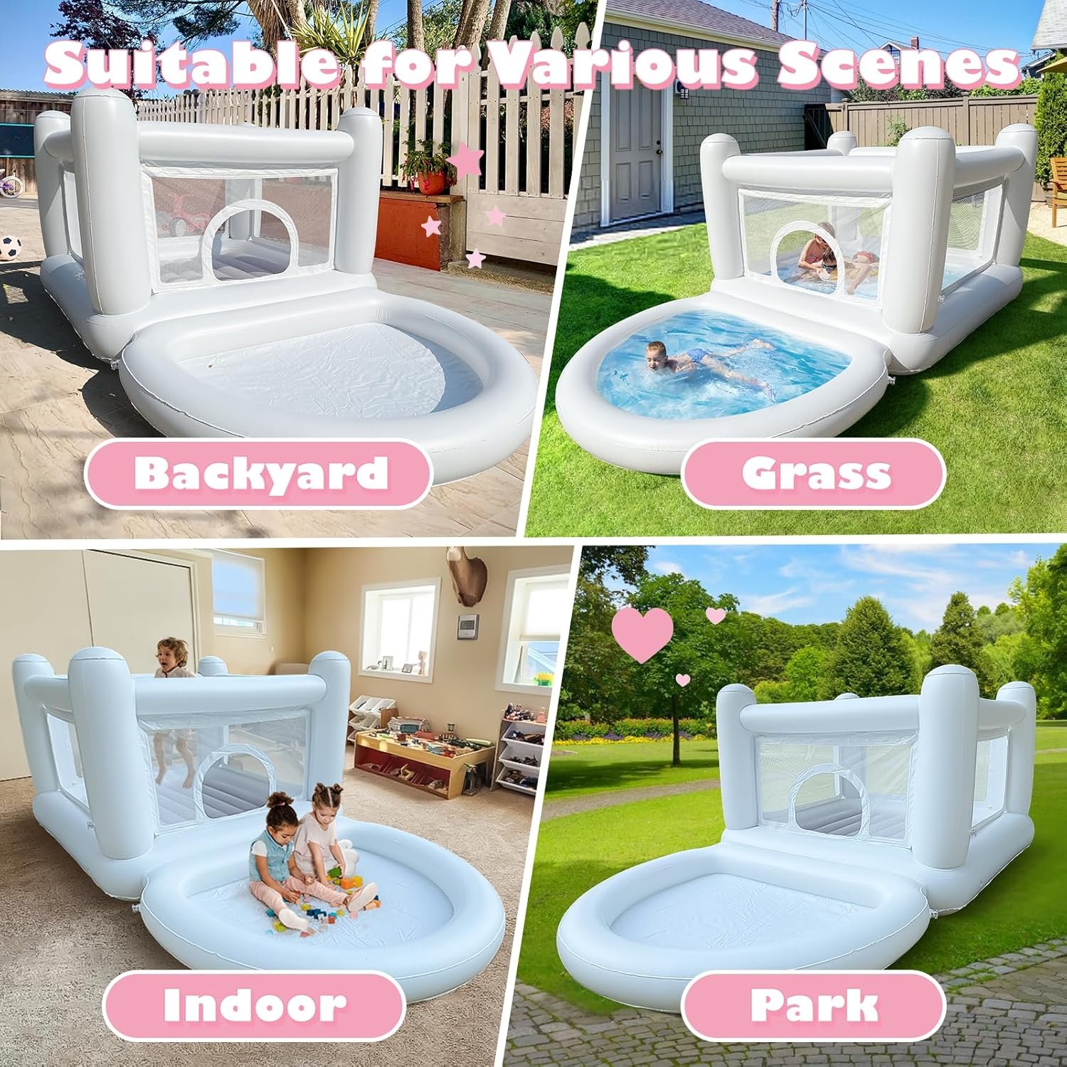 The inflatable bounce house is designed for children aged 3-8, measuring 118.5 x 68.9 x 59 inches with a 48.8 x 44 x 4-inch inflatable pad. Made from high-grade, easy-to-clean PVC, it features anti-friction, anti-tear, and anti-fading properties. Safety nets surround the bouncing area, ensuring stability and supervision. It offers multiple functions, including water play for summer fun. Quick to inflate and deflate for storage, this bounce house is ideal for parties and celebrations, providing a fun and safe environment for children to play and interact.