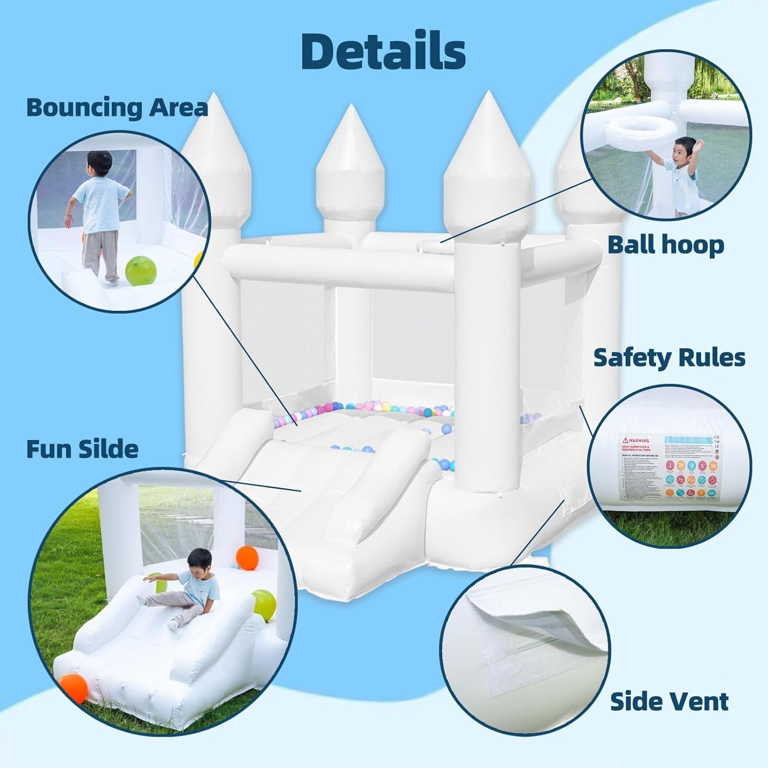The HAPYBOUCY bounce house is made from non-toxic, durable PVC, featuring excellent abrasion and weather resistance. Measuring 8.97ft L x 6ft W x 7.18ft H, it offers ample space for kids to enjoy. The package includes a powerful air blower, colorful balloons, storage bag, repair kit, ground stakes, and assembly instructions. It sets up in just one minute, making it easy for spontaneous playdates. With its stylish white castle design, it’s perfect for any occasion and serves as an unforgettable gift for children. Note: intentional seam leakage allows for safe inflation.