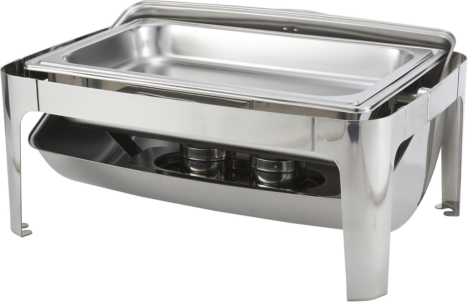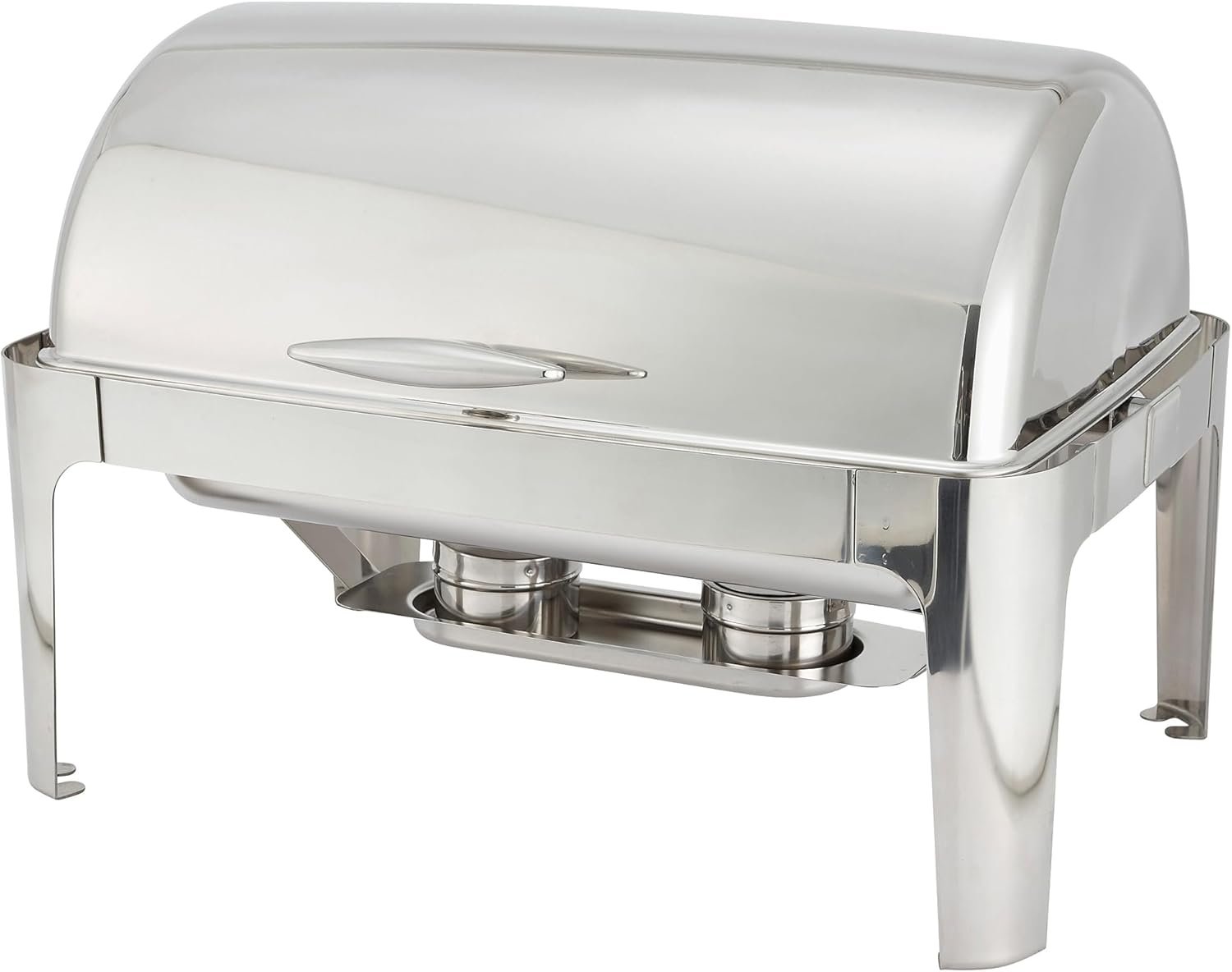 The Winco Madison 8 qt. Full-Size Roll Top Chafer is ideal for buffets and catering events. It features an 8 qt. capacity with a roll top design that opens up to 90 degrees. The chafer includes one full-size, 2.5-inch deep food pan, a dripless water pan, a dome cover, and two fuel holders. Its stainless steel construction provides a mirror finish, ensuring durability and an elegant presentation. Model #: 601 6004560.
