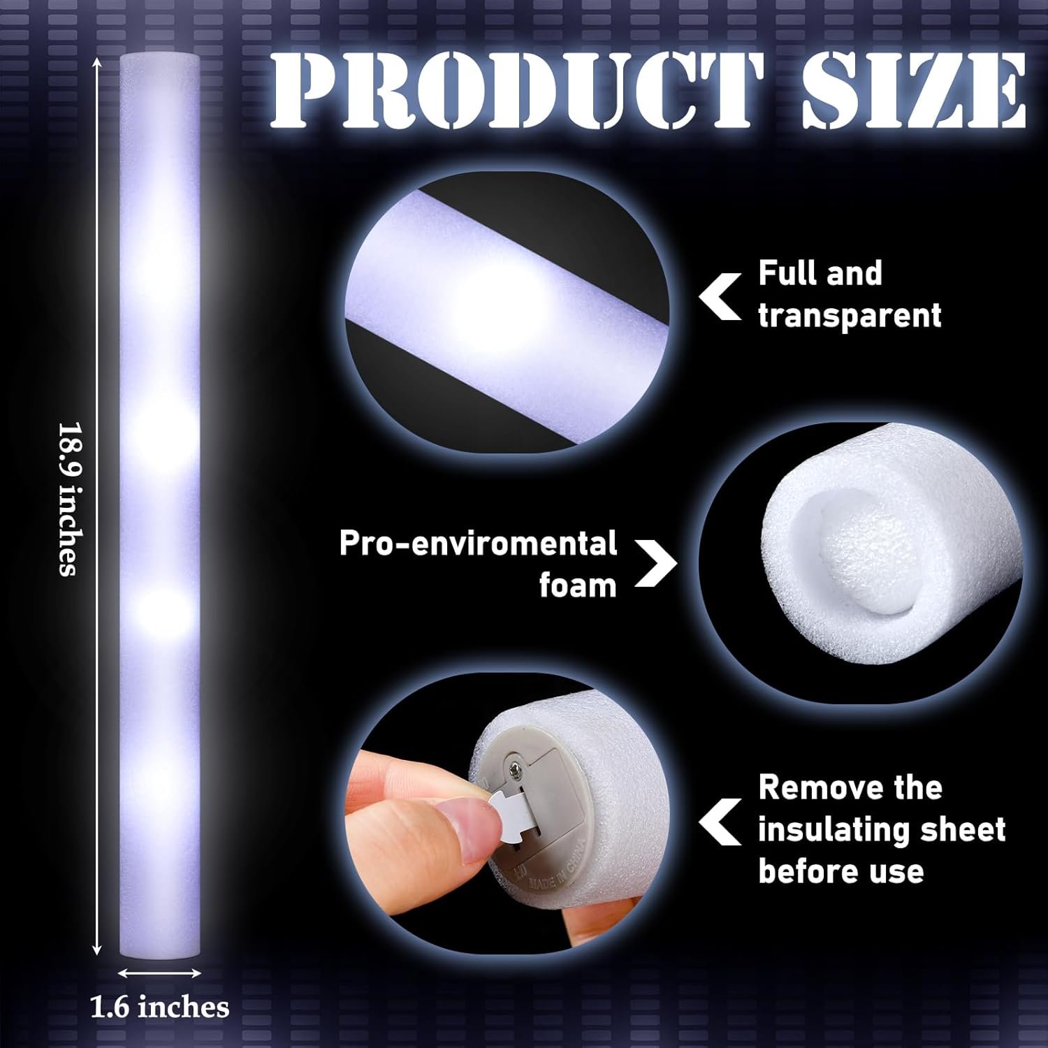 The product offers 200 white glow sticks, each measuring 18.9 inches and designed for ages 3 and up. They feature three flashing modes: fast, slow, and variable speed, making them perfect for weddings, concerts, parties, and night sports. Each stick is battery-powered using replaceable AG13 batteries and includes an insulating sheet for safe usage. Made of sturdy foam, they are light, durable, and safe, with no glare. The glow sticks are ideal for creating a vibrant atmosphere and are easy to turn off to conserve battery life. Prices range from $31.99 to $153.99 depending on the quantity.